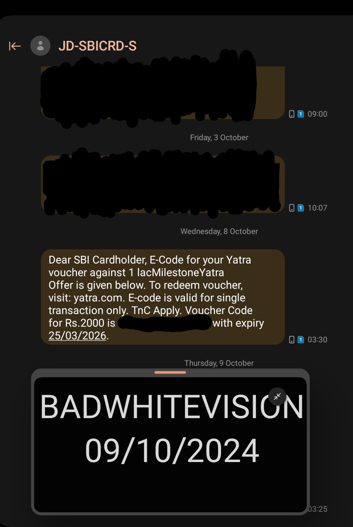 “Dear SBI Cardholder, E-Code for your Yatra voucher against 1 lacMilestoneYatra Offer is given below. To redeem voucher, visit: yatra.com. E-code is valid for single transaction only. TnC Apply. Voucher Code for Rs.2000 is X with expiry 25/03/2026.”