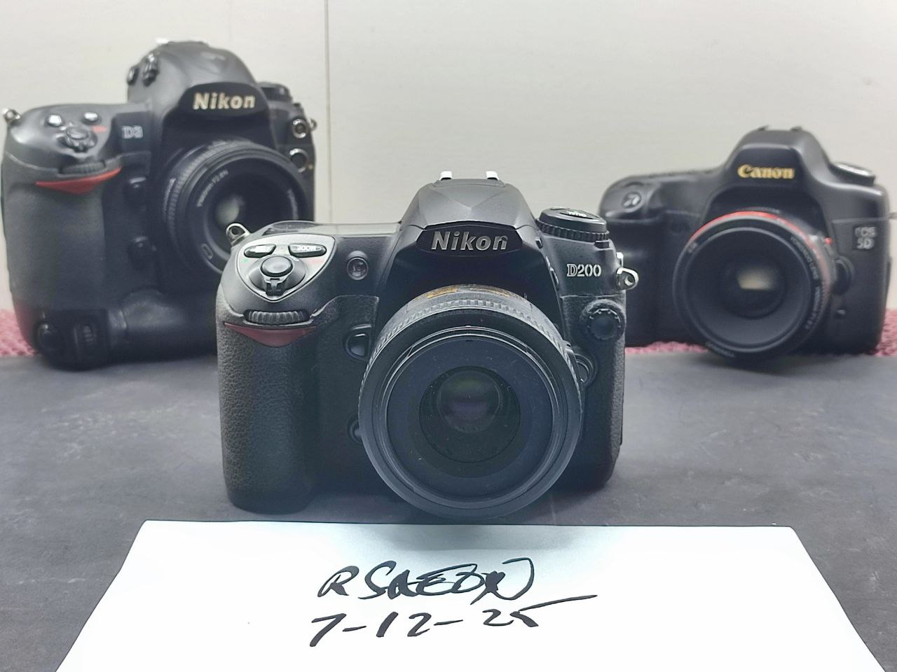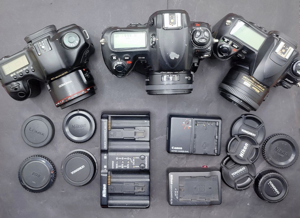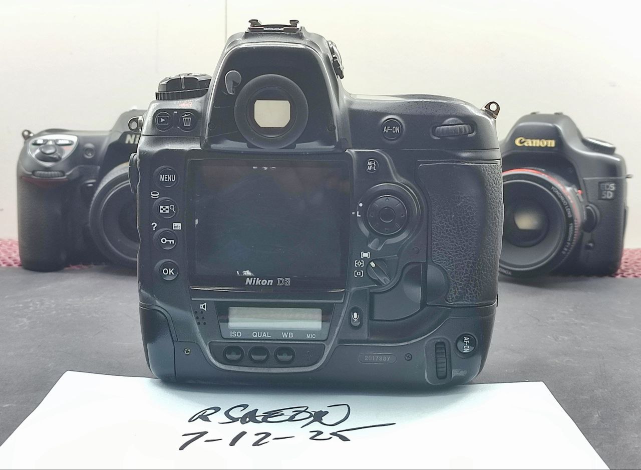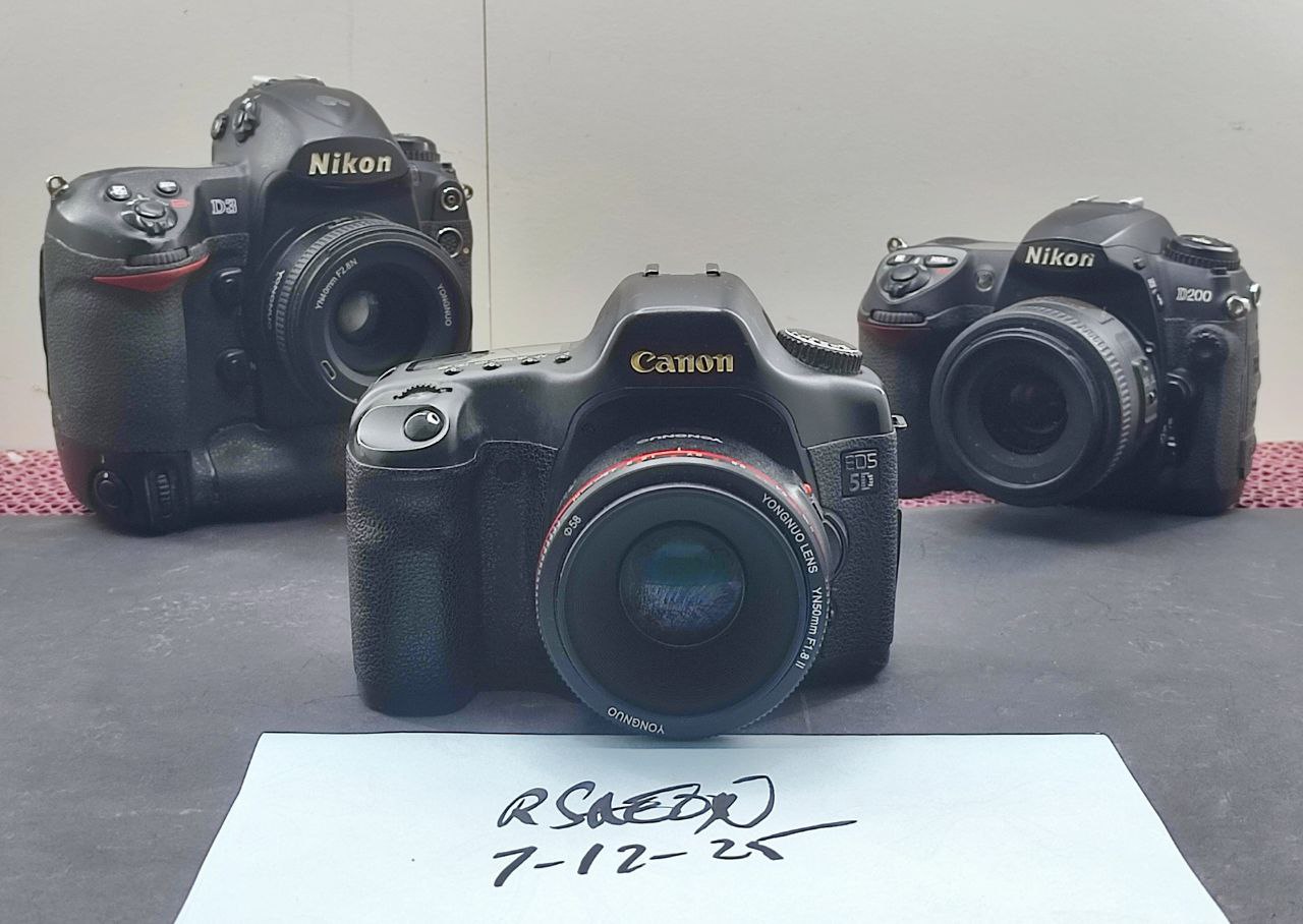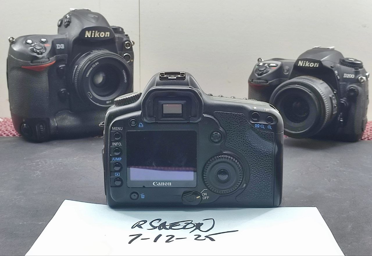 The D200 is in the best condition, followed by the 5D that has a dim LCD and the D3 which has paint chips and some kind of white organic growth in the rear LCD.
