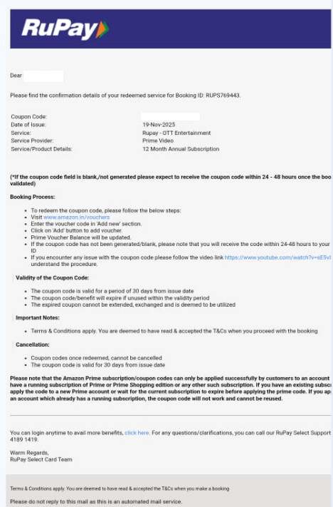 Got Amazon Prime Voucher code from Rupay debit card selling them as I don’t need them.