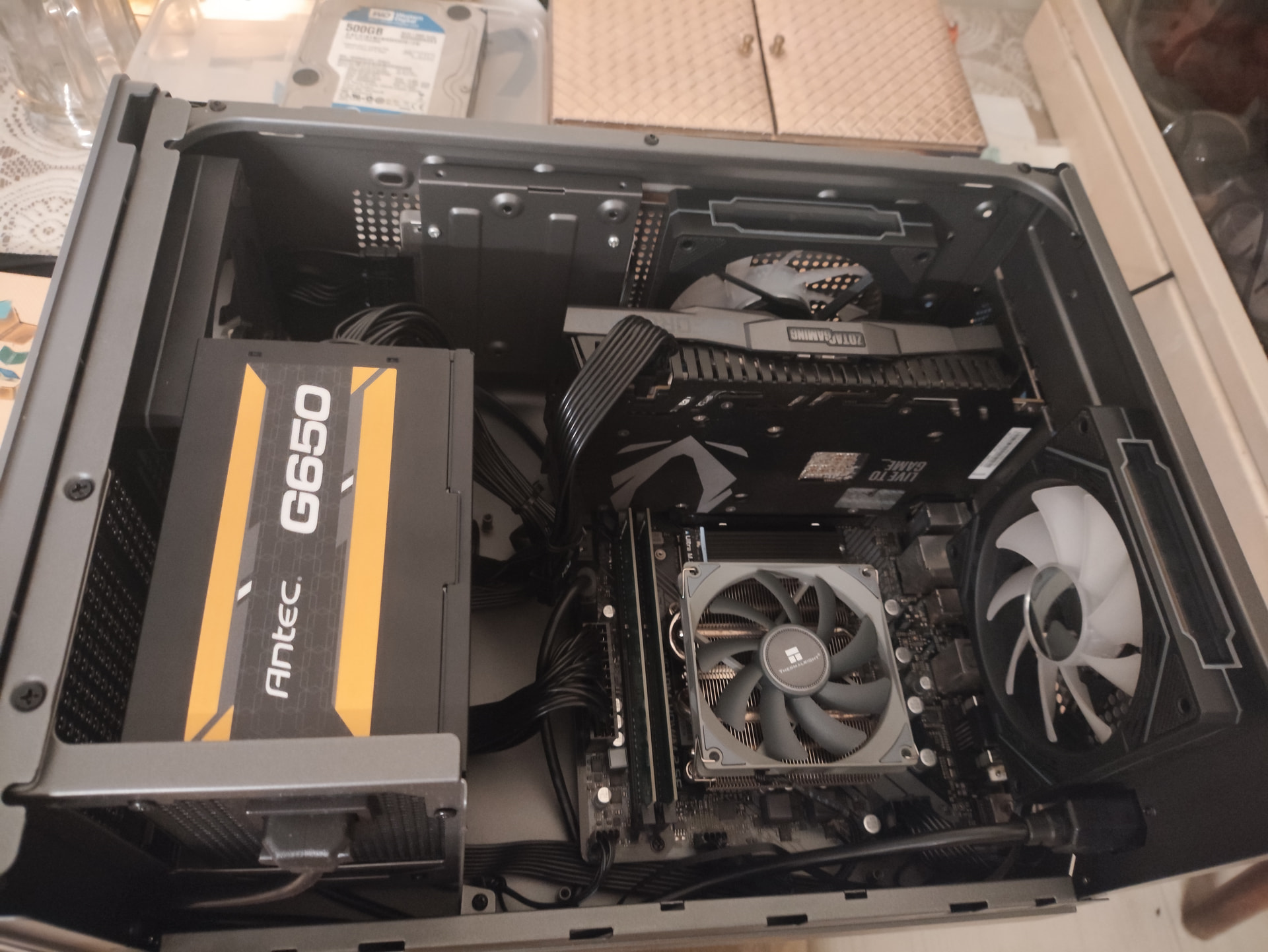 He is using a 2070 mini, one fan at front & one fan at bottom (because using sata ssd so 2 bottom fans not possible). For typical large card I don’t think putting bottom fans is possible.