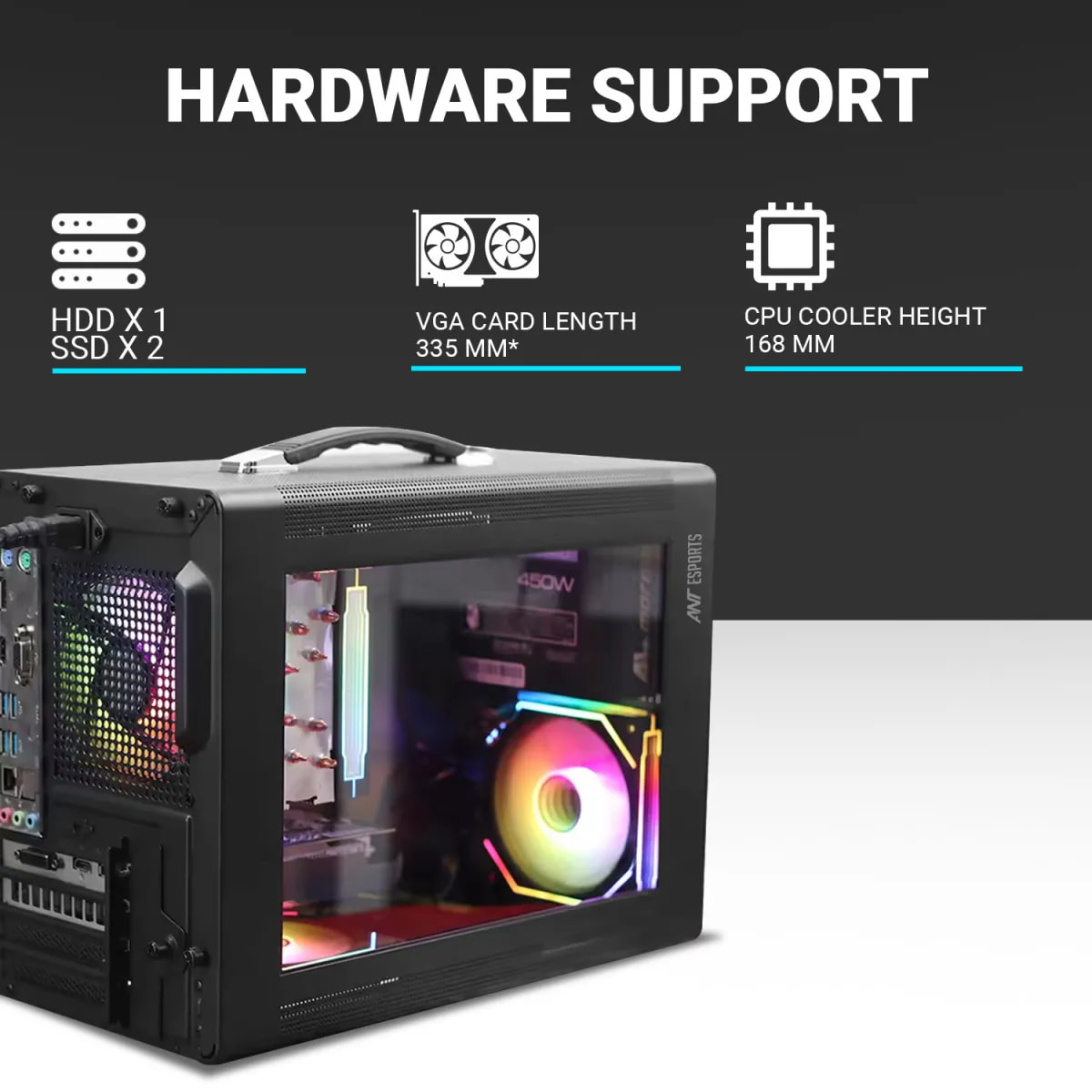 VGA Card Length : 335 mm ; CPU Cooler Height : 168 mm, Max PSU Length : 180mm (SFX/ATX)