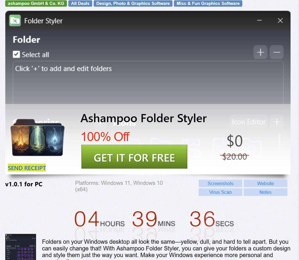 Link (in new line below):Ashampoo Folder Styler - Misc & Fun Graphics Software - 100% PC