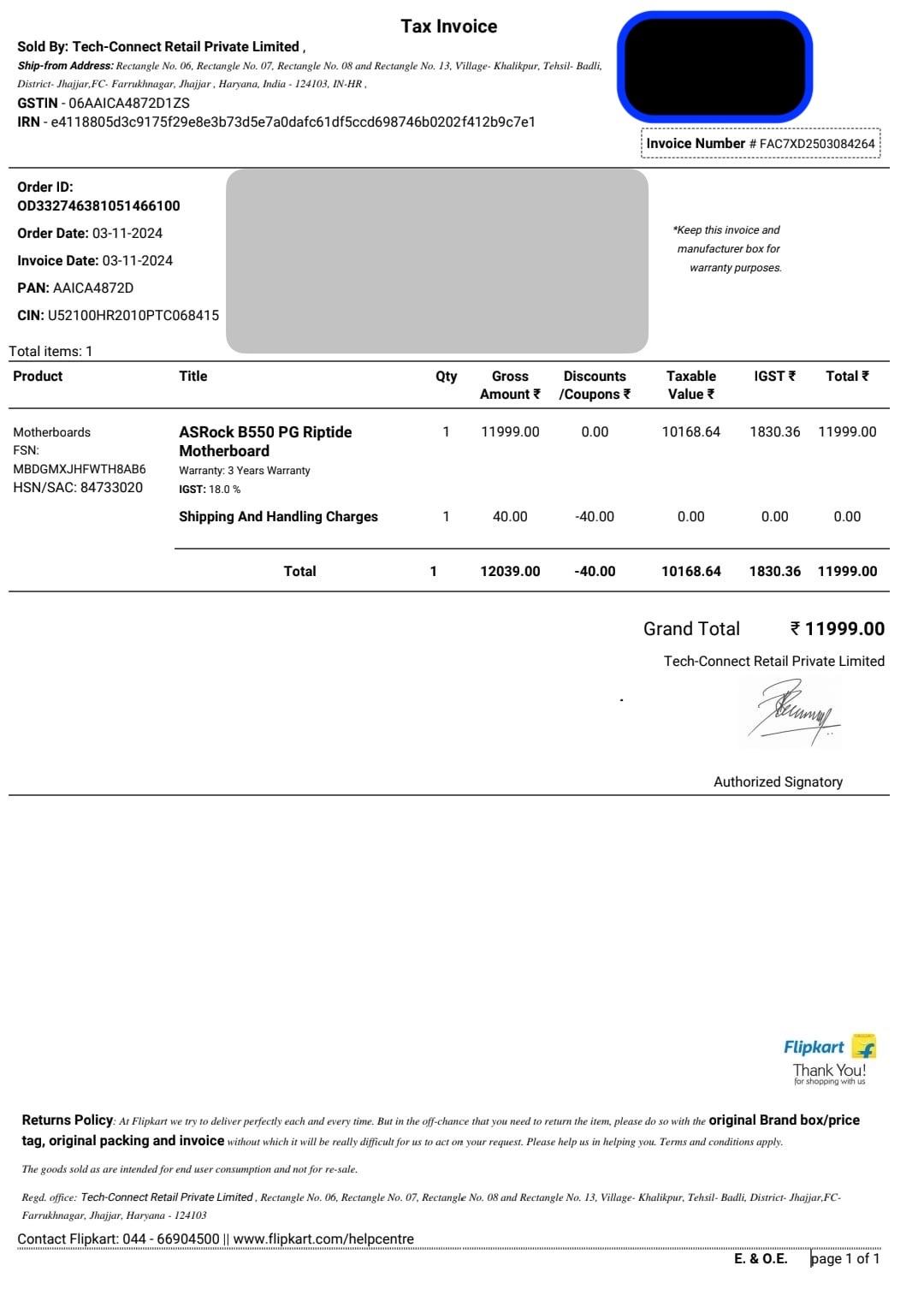 Description: Purchased from Flipkart on 3rd nov 2024. It comes with the original box.