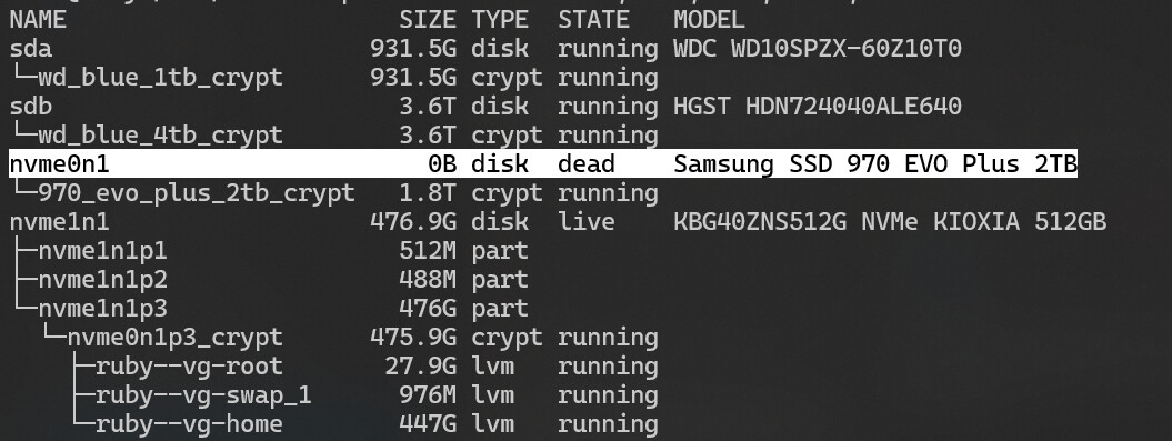 The NVME controller has failed. You can see the kernel sees the NVMe namespace as 0B and marks it dead.