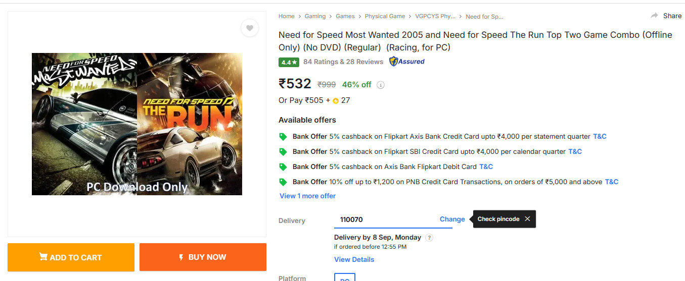 2 days ago, I ordered NFS Most Wanted from Flipkart for INR532. Its PC Download. What I don’t understand is why there is a delivery time, as if they are gonna deliver a DVD? In case of software they could have immediately provided a download link right after the payment?