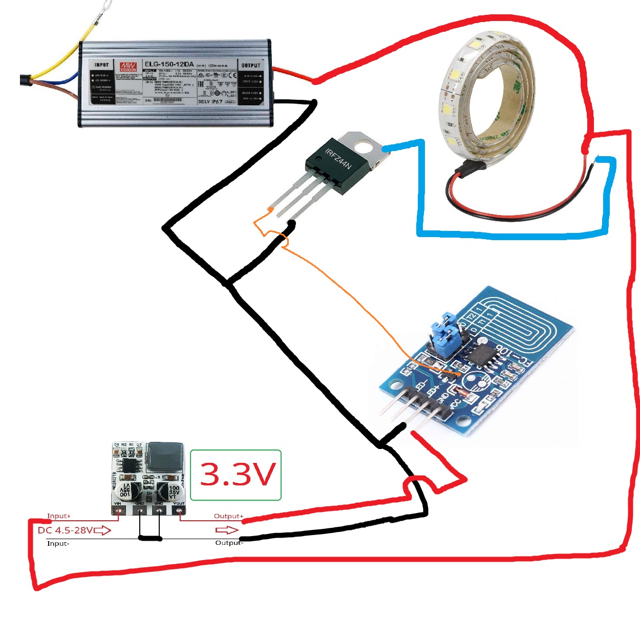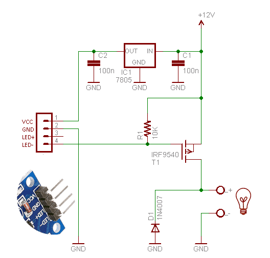 This is the circuit that is needed to drive a 12V LED strip from this module. We have to use a P channel Mosfet or PNP transistor. The parts are cheap.