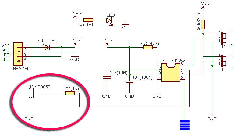 LED+ goes to VCC through the 33 Ohm resistor which is essentially a current limting resistor for the LED (large SMD one , with 360 written over it).