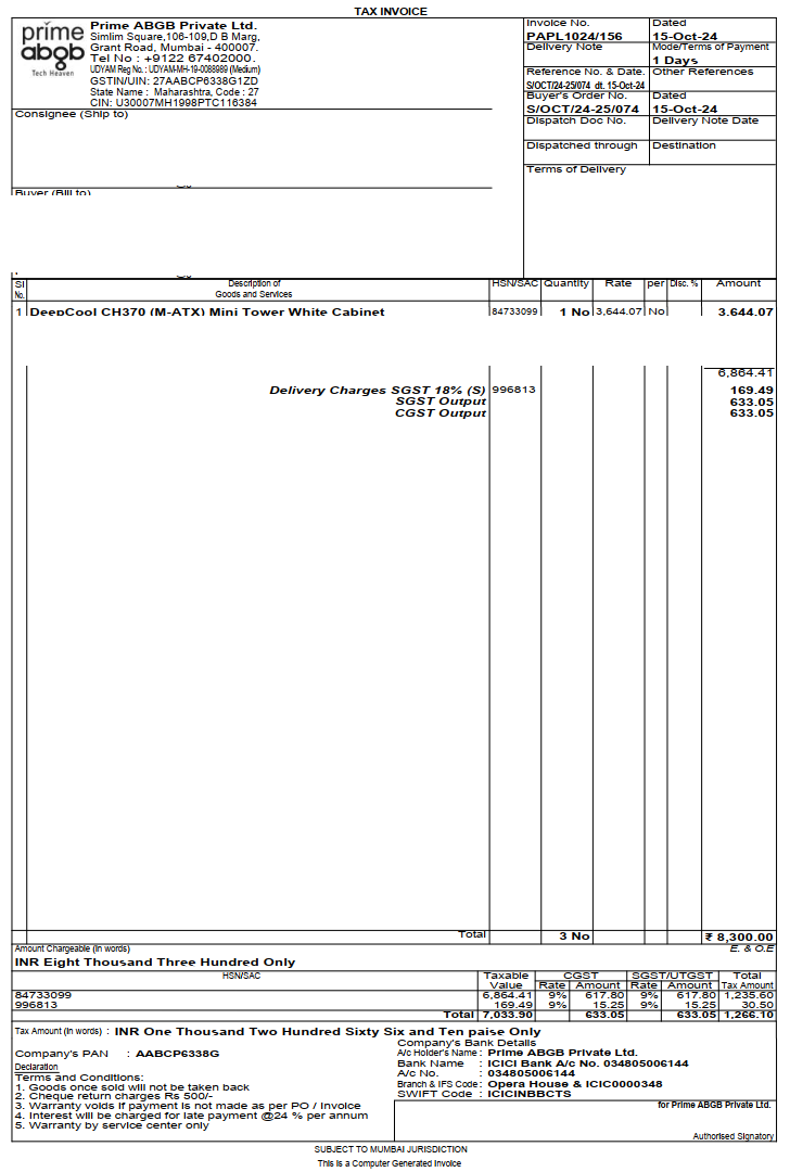 Description**: Purchased this cabinet from PrimeABGB on 14th October 2024. It comes with the original box & preinstalled 120mm fan. Condition: Mint 4.5/5 Invoice Available: Yes Warranty: 1 year from date of purchase