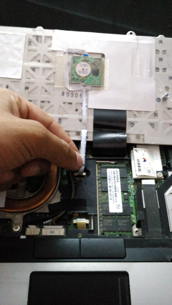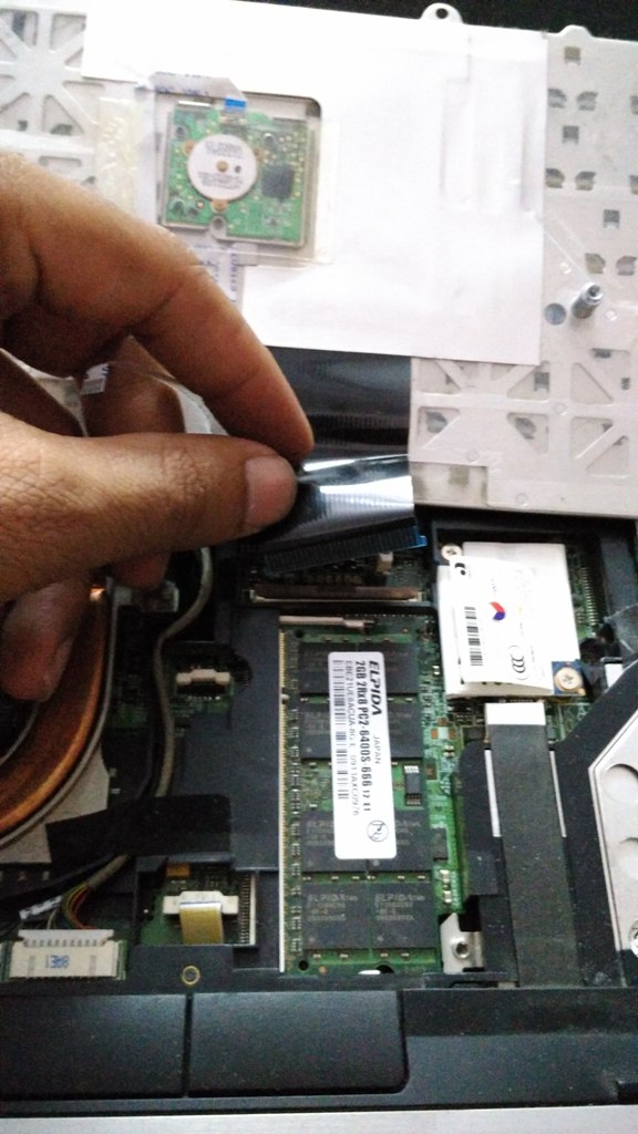 once you are done removing/loosening these screws, you would have to remove the keyboard gently. sorry i do not have the pics of the same. keyboard is held in place by few notches on the sides - you can see these if you observe carefully. you can pry it out- make sure you don’t pull it out at once because there are couple of flat cables attached to the base. below pics. both have push and lock type couplers.