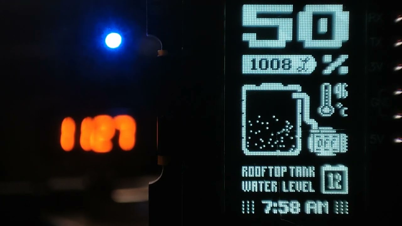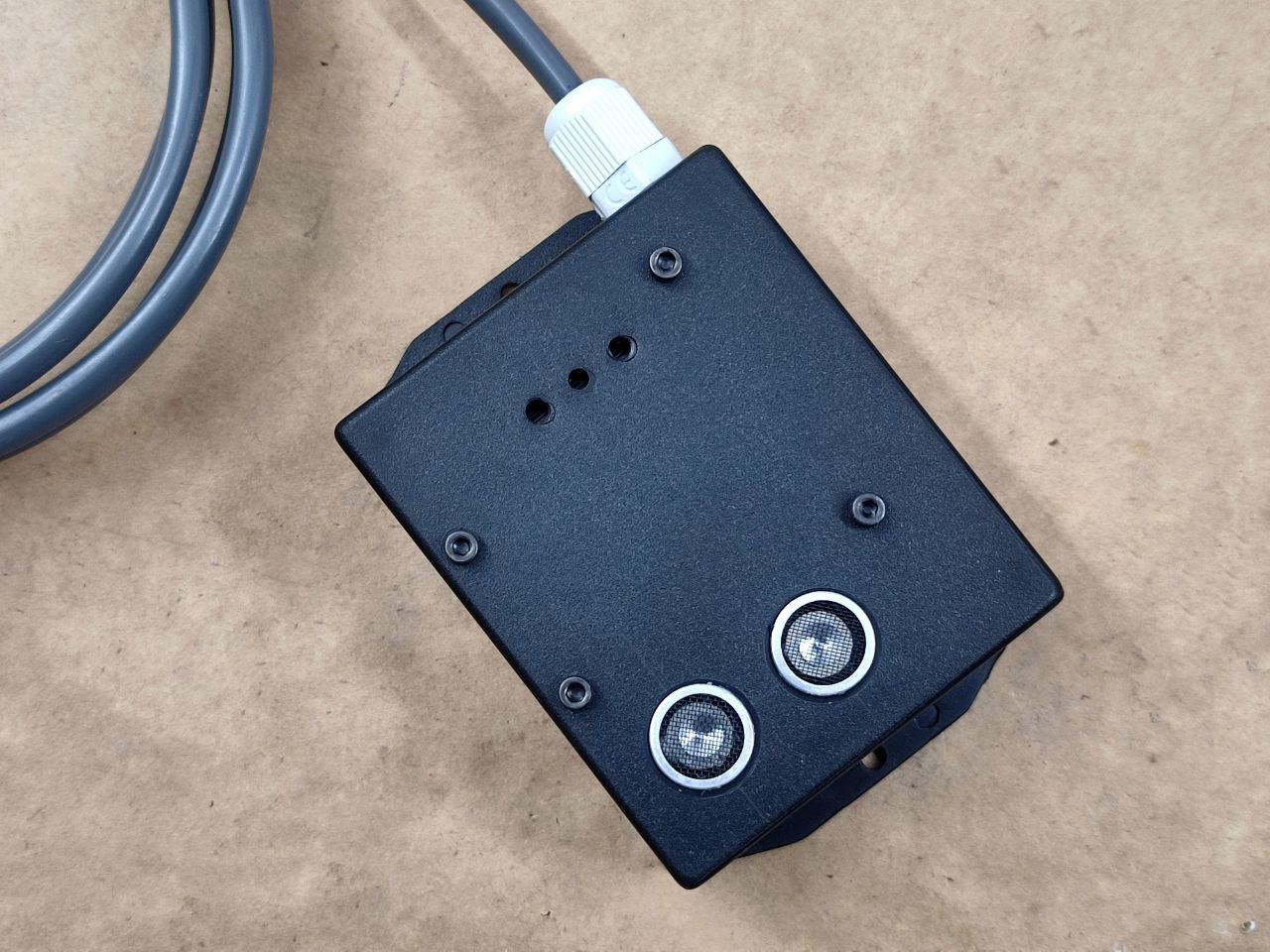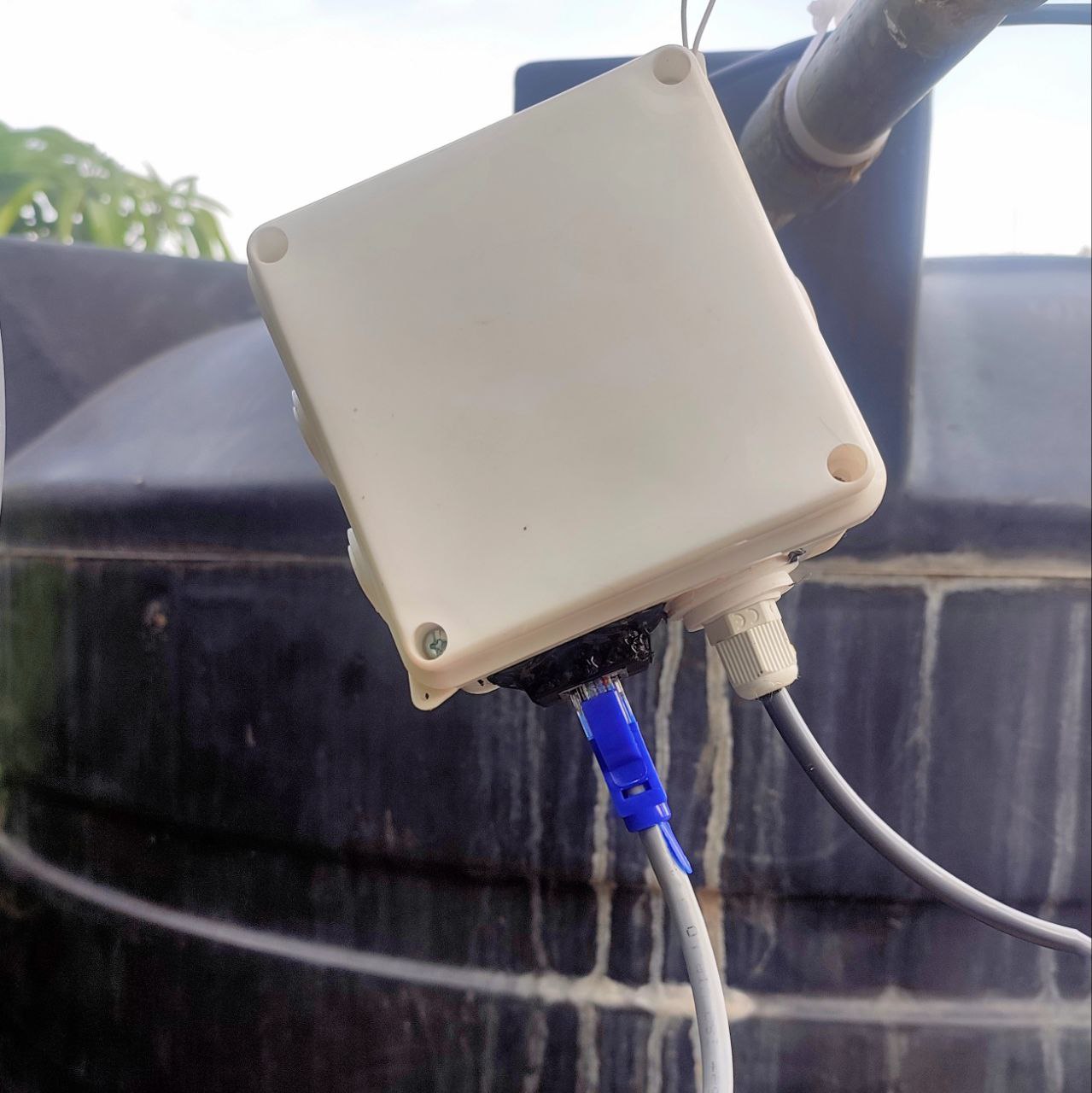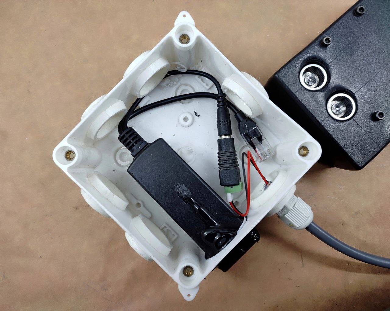 We need this sensor to read the water level inside the tank. For this we’ll be using the US-100 Ultrasonic Distance Sensor module. This sensor is 3.3V logic compatible and has a UART mode where it returns a distance reading that takes into account the current temperature for better accuracy. This sensor is wired to a ESP8266 module which is flashed with Tasmota and powered by POE. More info on the software bits after the photos.
