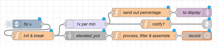 I called the overhead tank ‘elevated_pot’. You should have MQTT and optionally InfluxDB configured with Node-RED. You can delete the ‘record’ node if you don’t want or need the database.