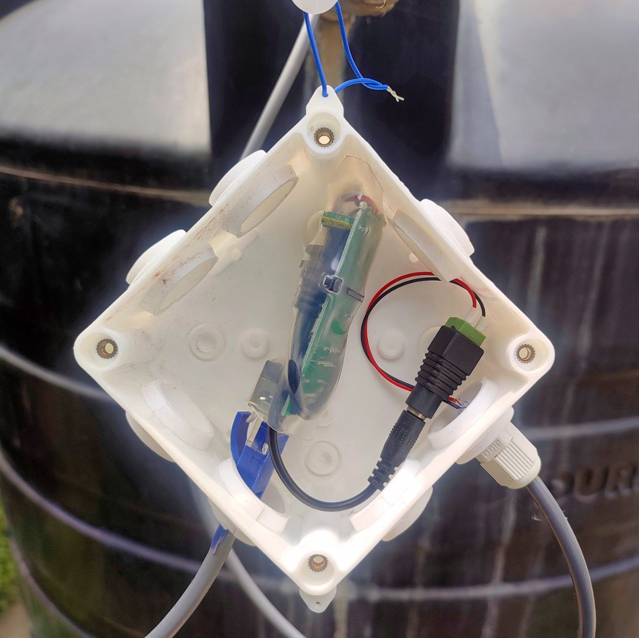 And finally the junction box is hung with a wire, with the cables pointing downwards to discourage water ingress during rains: