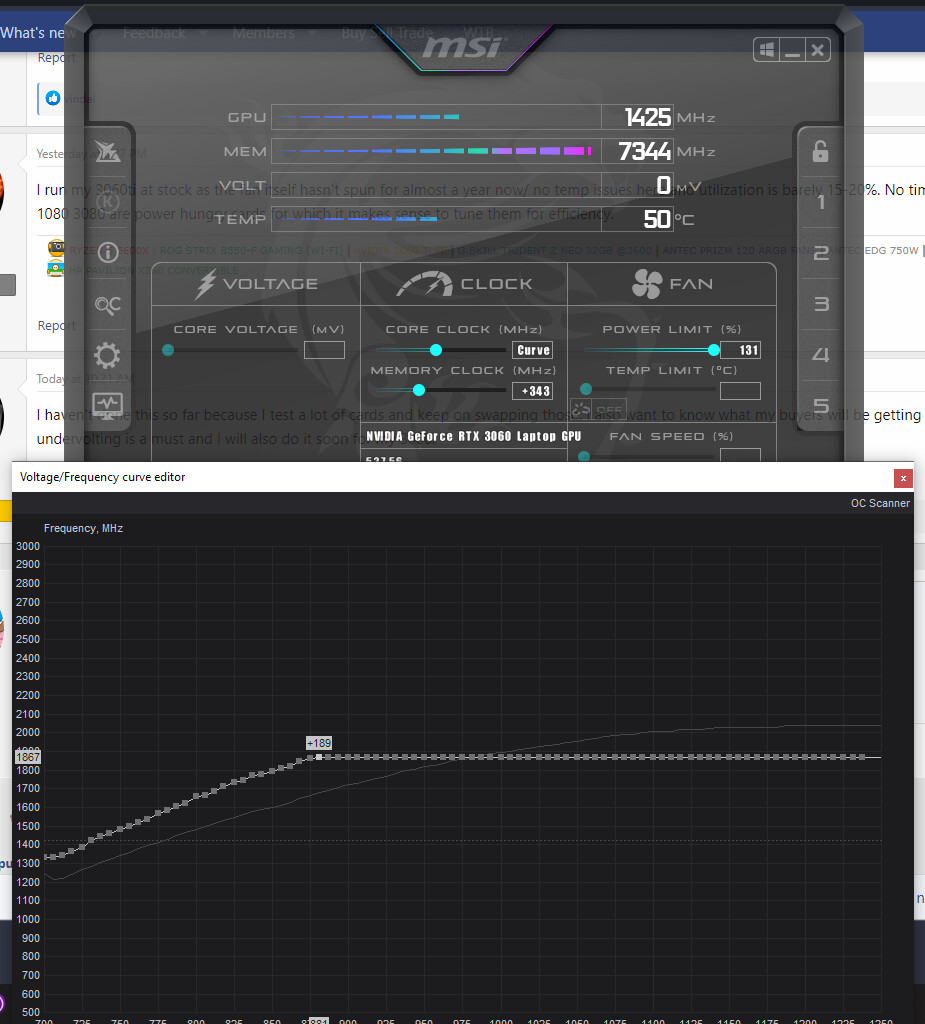 Undervolted my Helios 300 w/ 105W RTX 3060 to 1876MHz @ 881mV (compared to stock boost of about 1880Mhz boost at about 1000mV). Attaching graph of the UV curve done via MSI Afterburner. Reduced temps by about 6C with a very slight performance increase.