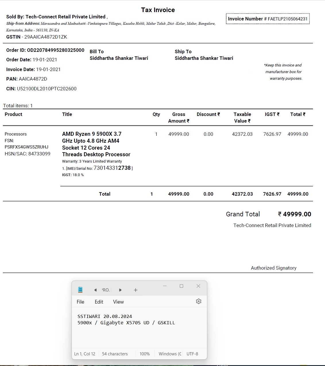 AMD Ryzen 9 5900x **Processor: ** Expected price Rs. 17000/-. Bought on 19.01.2021. Working flawlessly. Box and Bill available. Condition 7/10(due to age, no other issue). No warranty.