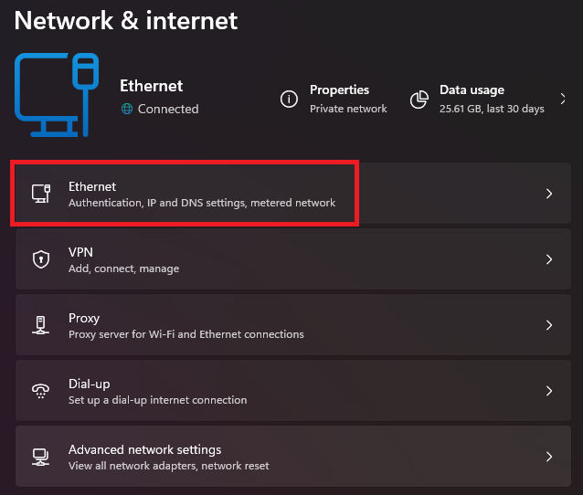 - Click on Ethernet (or Wi-Fi if you’re using a wireless connection).