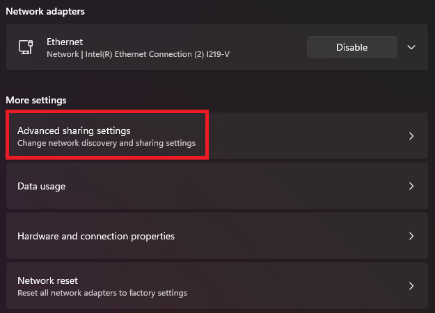 - Under Advanced network settings, select Advanced sharing settings.
