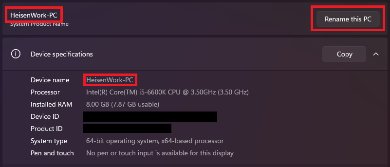 - In the Device specifications section, you’ll see your PC’s Device name. By default, it will be a cryptic name (e.g.,