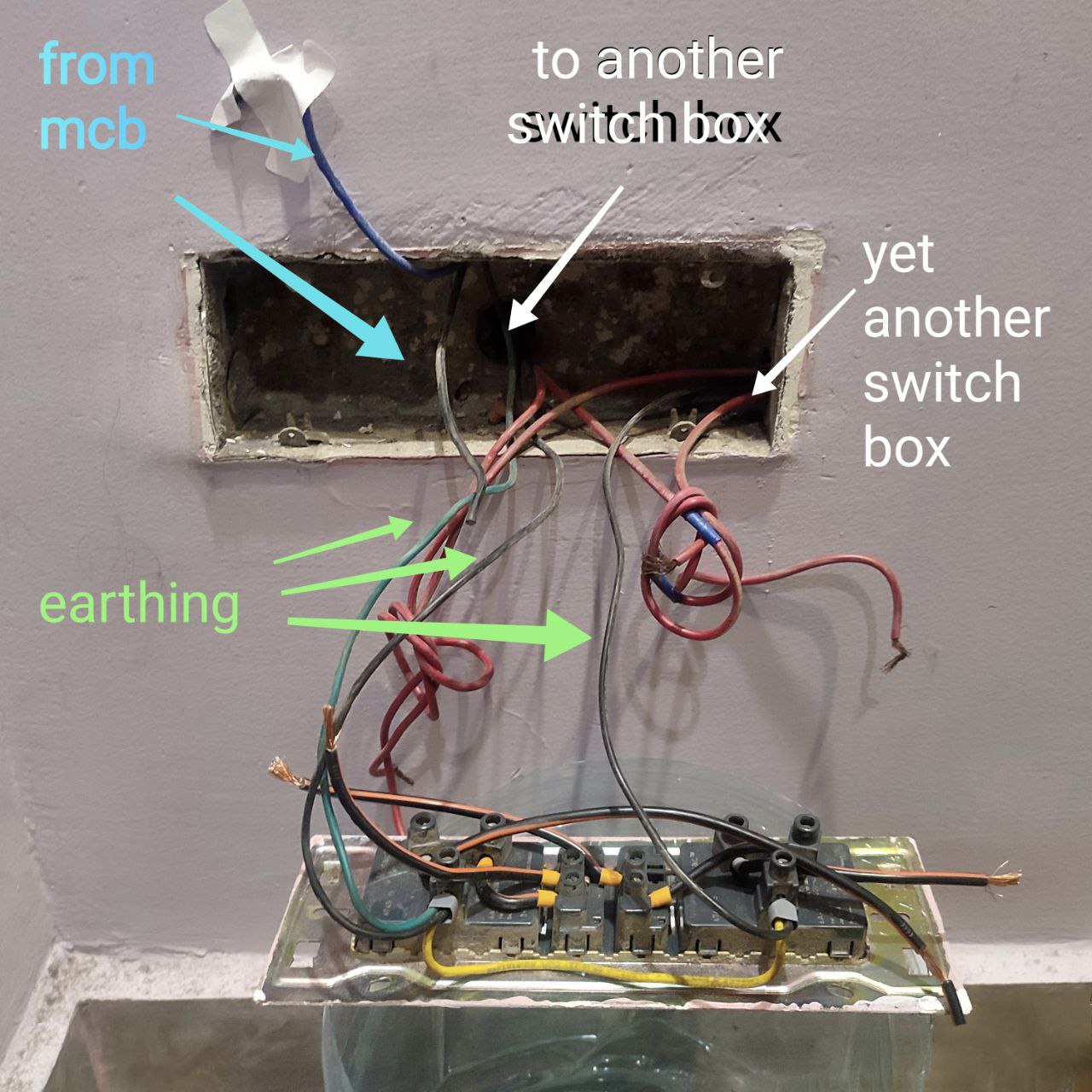 See the four red wires? Two are from the mcb box and two are going off to another switch box.