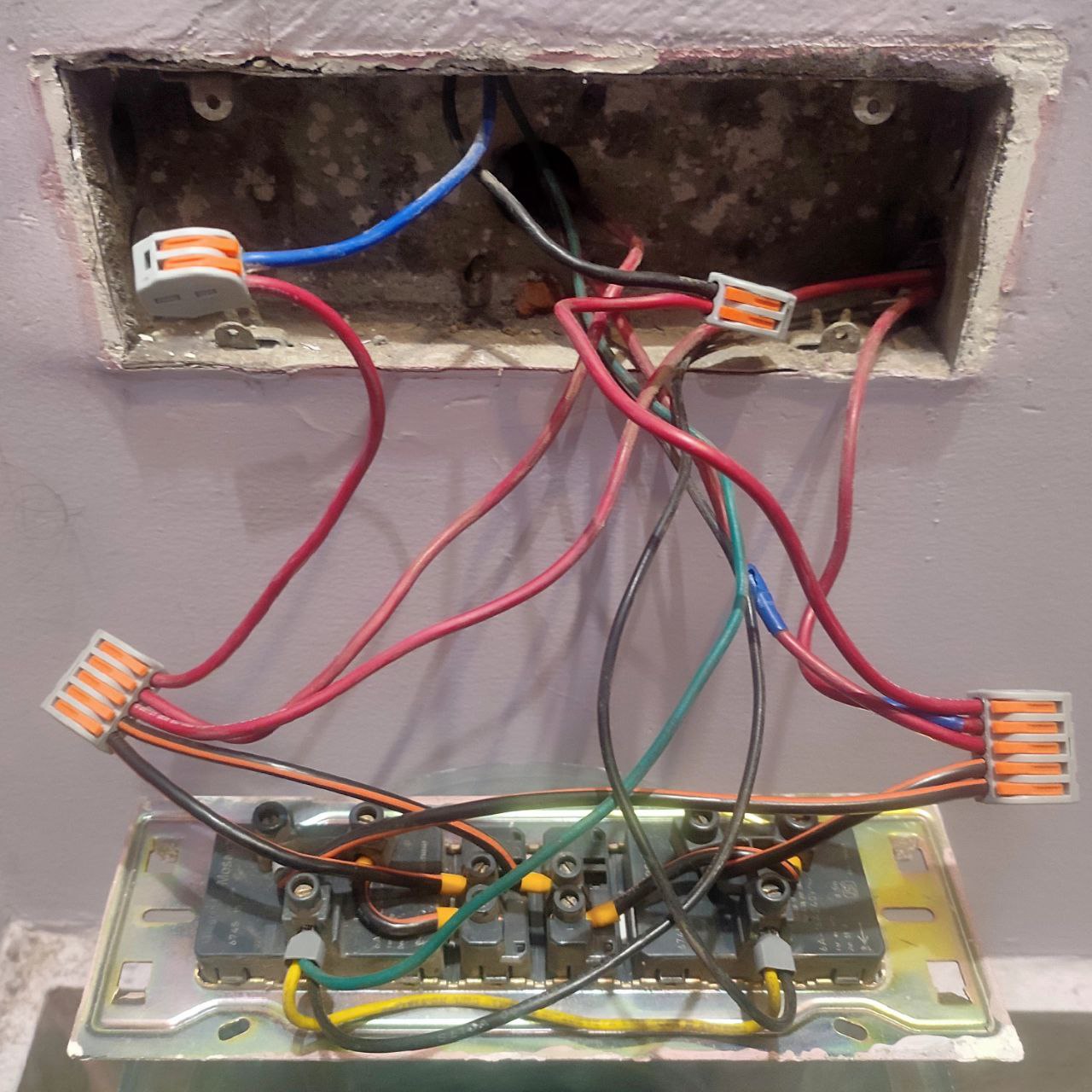 The 2.5 sq mm blue and black wires from the distribution box are wired to EIGHT (!) 16A sockets, itâs complete insanity â Iâm going to put warning stickers on every socket, something like â2A/500W max.â