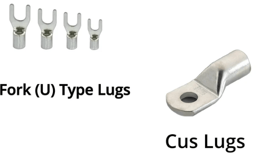 Fork U type lugs are typically used for terminals in AC , Motors etc . Cus Lugs are used for bolting at bus bars .