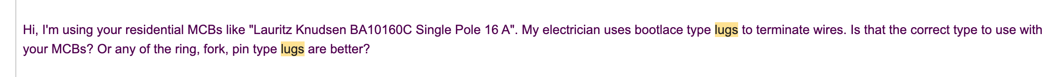 Can you tell me what type of lugs you are using with MCBs?