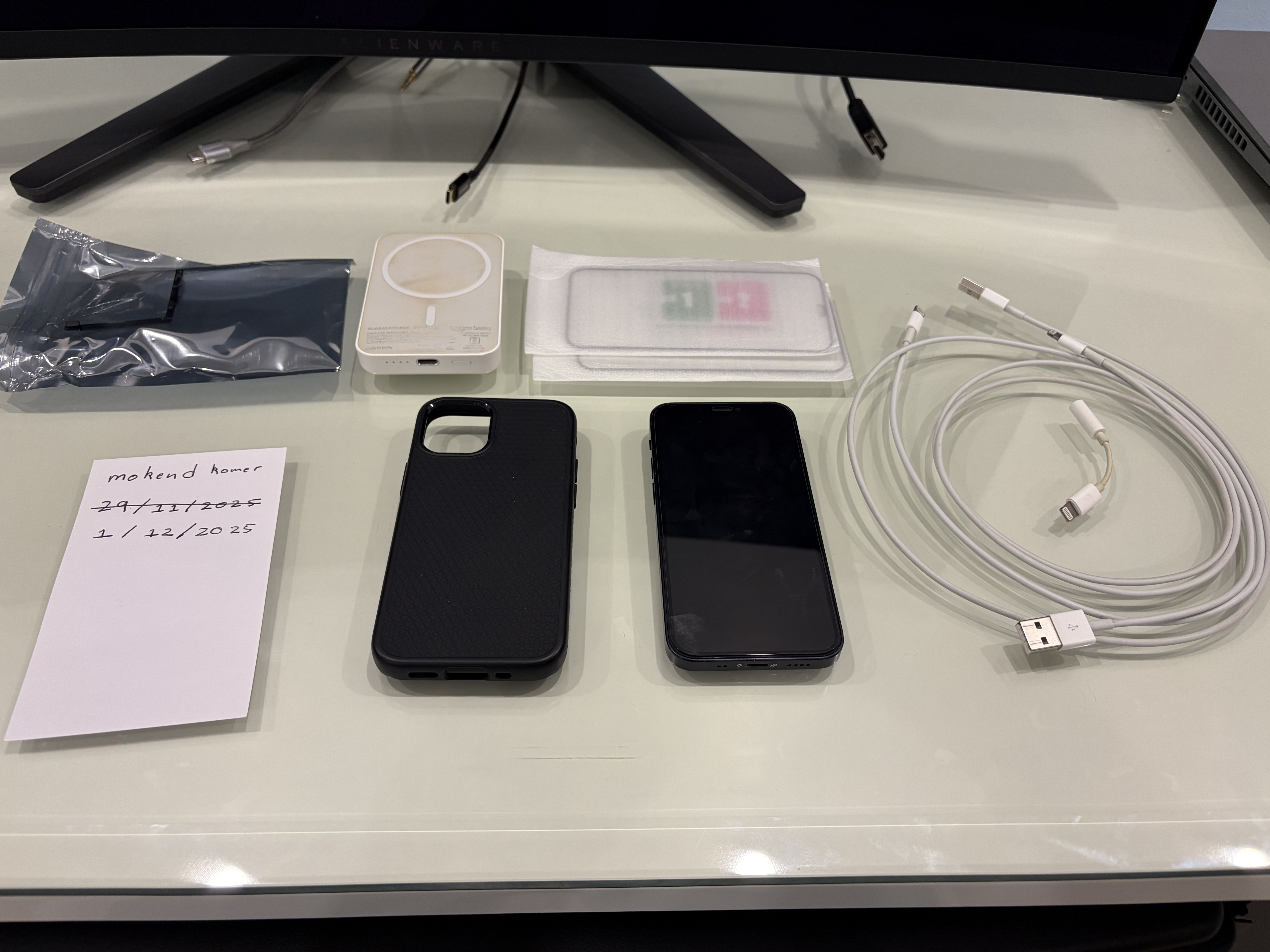 The phone comes with a spigen case, two official lightning cables, an official 3.5mm adapter, two screen protectors, an amazonbasics magsafe power bank, and the original BMS.