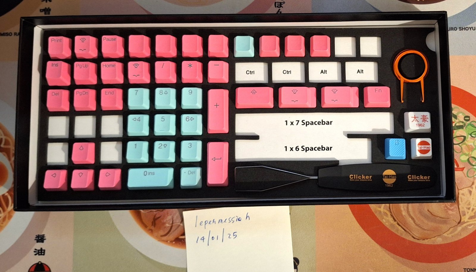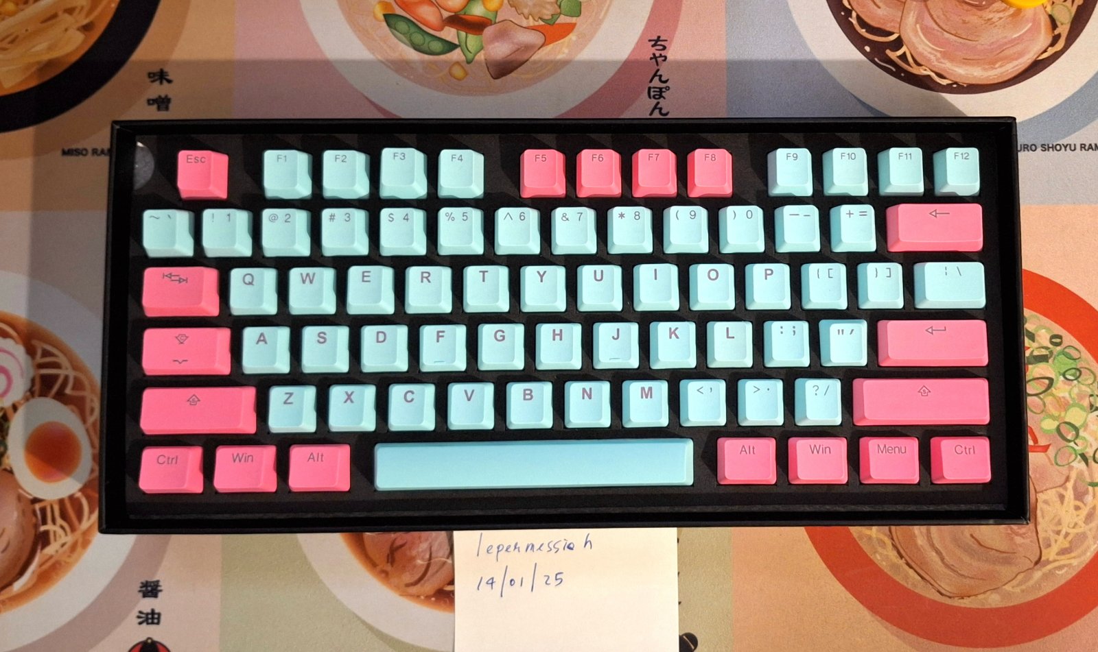) which cost me 4.6K. If I remember correcltly, Tai-Ho is an old Taiwanese company that’s been in this game for quite a while. It’s PBT double shot and has shine through legends (though it’s best for north facing LEDs). It’s thick and has got a rough matte texture for resistance against finger oil buildup and for better grip. I’m selling this because I liked the Glorious Pastel set that I bought from here better. Granted, this set is a little out there in terms of design, but if you’re looking for the 80s Miami vibe, this one has it.