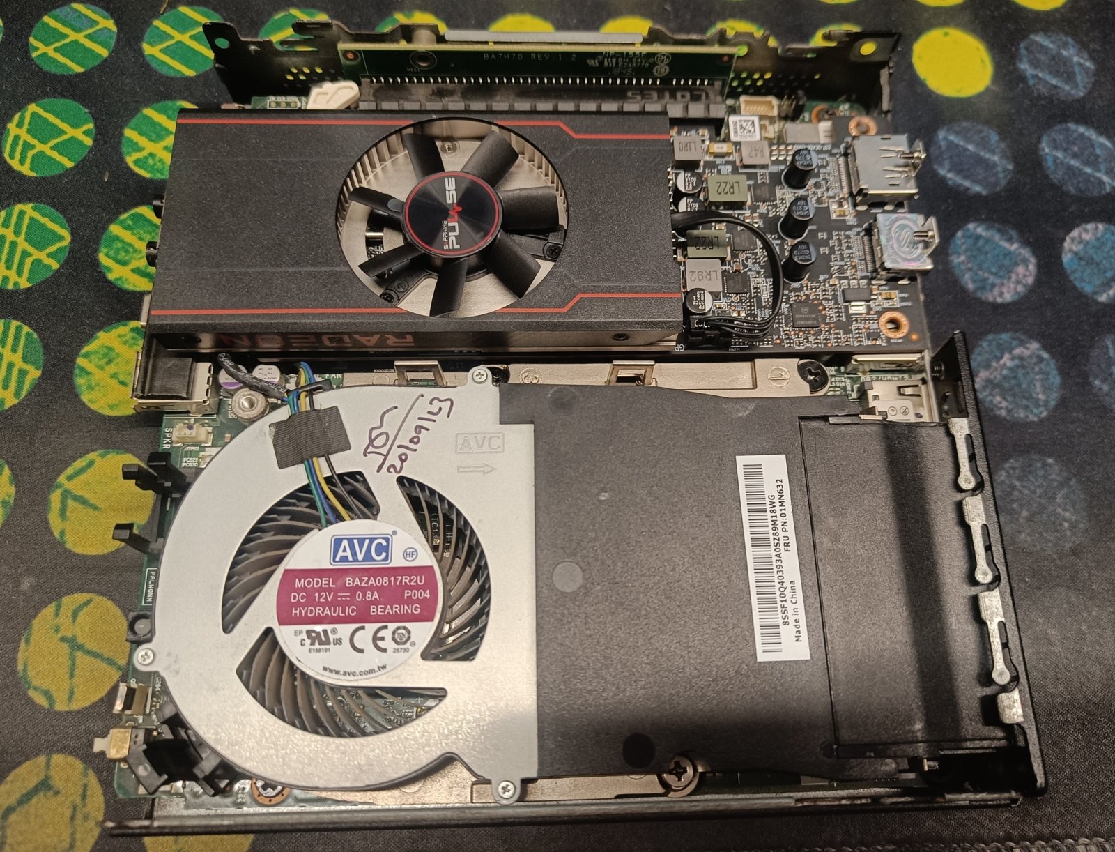 The GPU fits nicely, had to remove the speaker + bracket. Removed the PCIe bracket on the GPU for Airflow. The vent on the P330 Tiny’s cover exposes around 60% of the RX 6400’s fan, and it seems to be enough. Temps in games (At 100% GPU Utilization) remained in the 80s which is a big win!