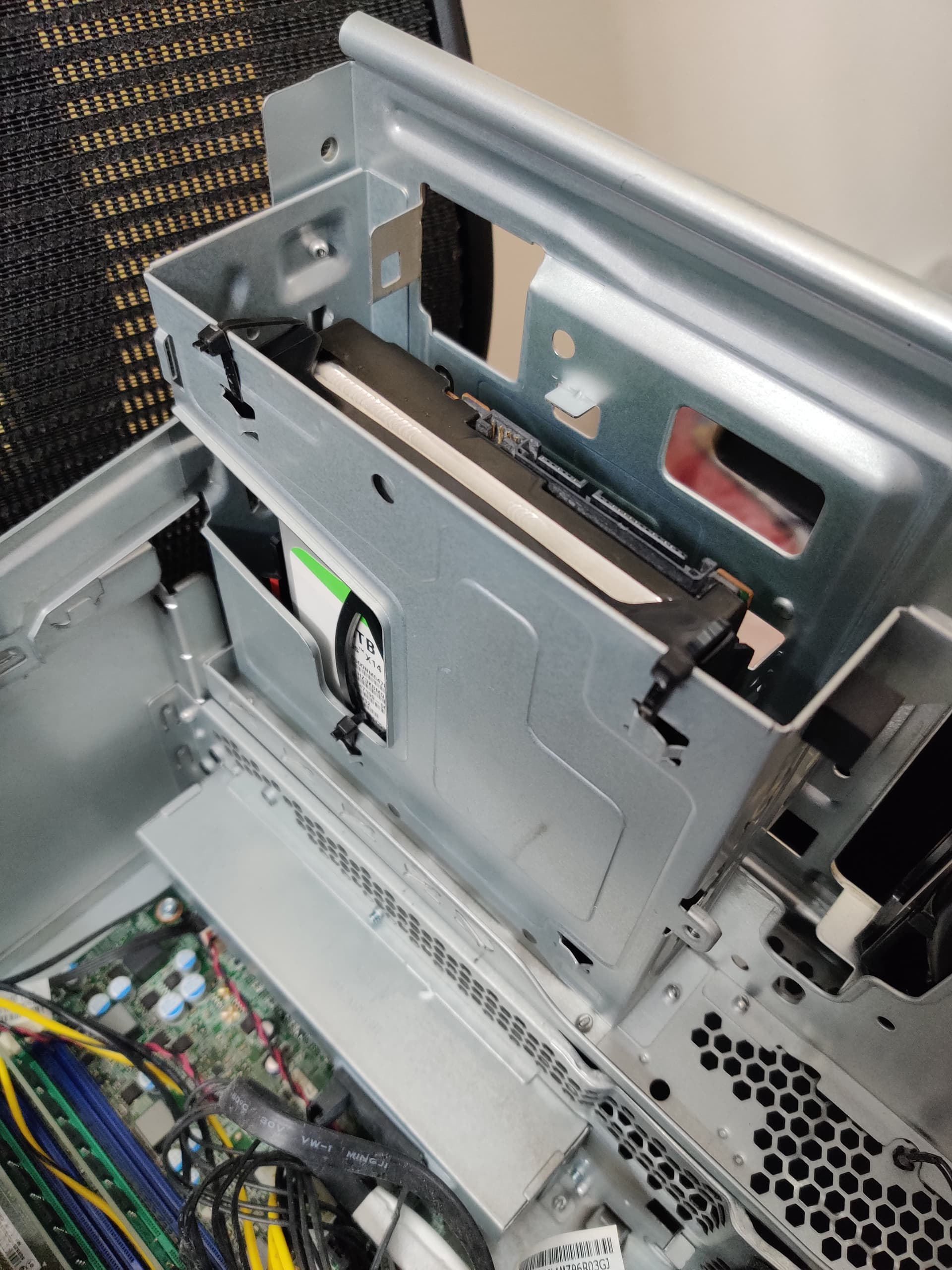 I had a spare plastic hdd tray from Lenovo, so I zip-tied it to the 5.25” bay. There’s barely any flex, and it’s nearly-vertically mounted. Clearances are tight, but temps are good. So I guess this will do for now, till I figure how to mount it better.
