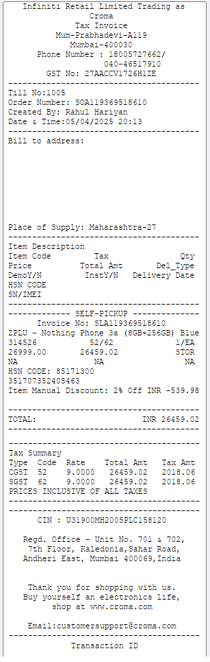 Description**: Purchased this phone from Croma on 5th April 2025. It comes with the original box and USB-C cable. The phone has been in the case and factory installed screen guard since Day 1.