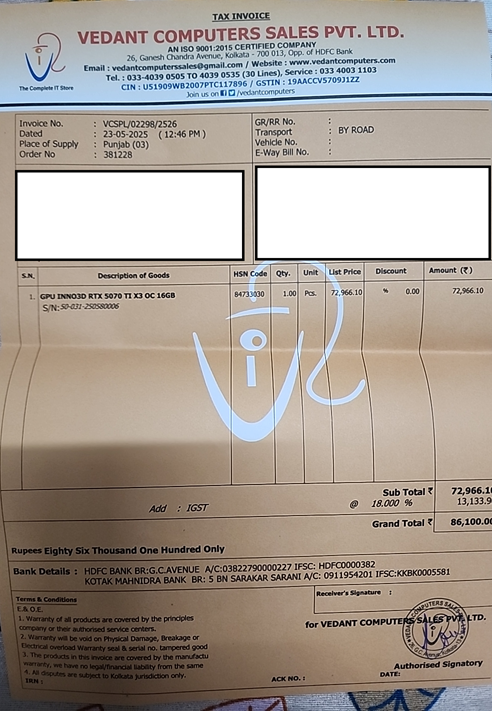 Up for sale is recently purchased inno3d 5070ti x3 OC. Unused. Just plugged in to check.