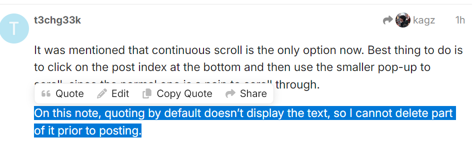 Thanks a ton @Renegade and all other staff members for getting everyone through the wormhole to a new and better world. Im missing one major thing is if anyone wants to access a thread with lots pages and replies it is feeling very difficult to get to some of those particular pages. I mean to say instead of infinite scrolling for a thread indexing with page numbers seems to very logical. Even if any one wants to directly to access the last and the most recent reply one has to scroll down all the pages and replies unnecessarily.