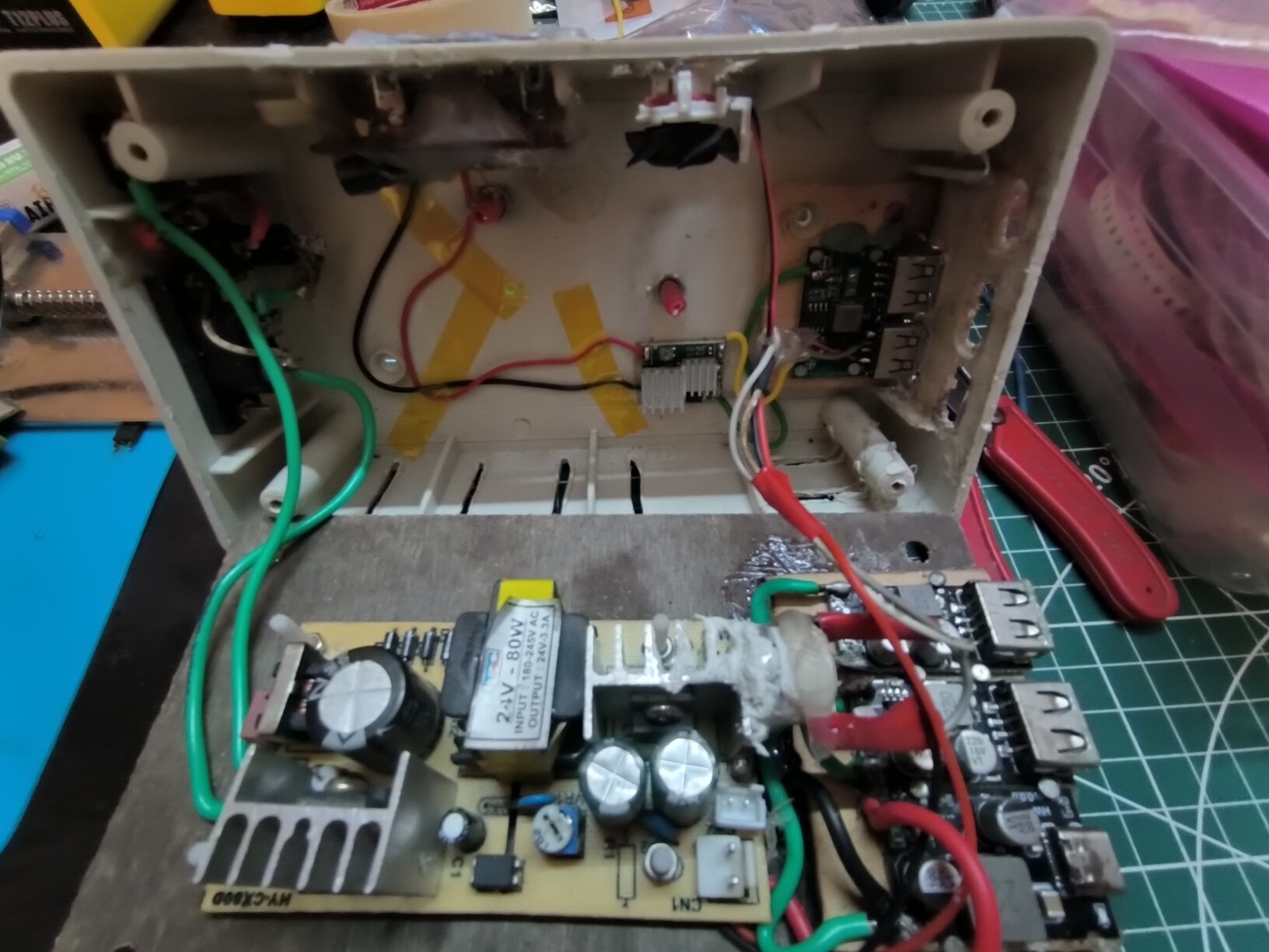 then I thought wait I need a lot more USBs (even if total capacity is not that much) even if a bit crappy so bodged a buck converter with a circuit board with a few female USB sockets
