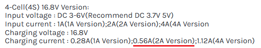 I could be wrong, but I think the charging module you have does not do CV/CC charging it does output CV but switches the frequency to somehow simulate the CV/CC behaviour, with maximum current of 0.56A in your case.