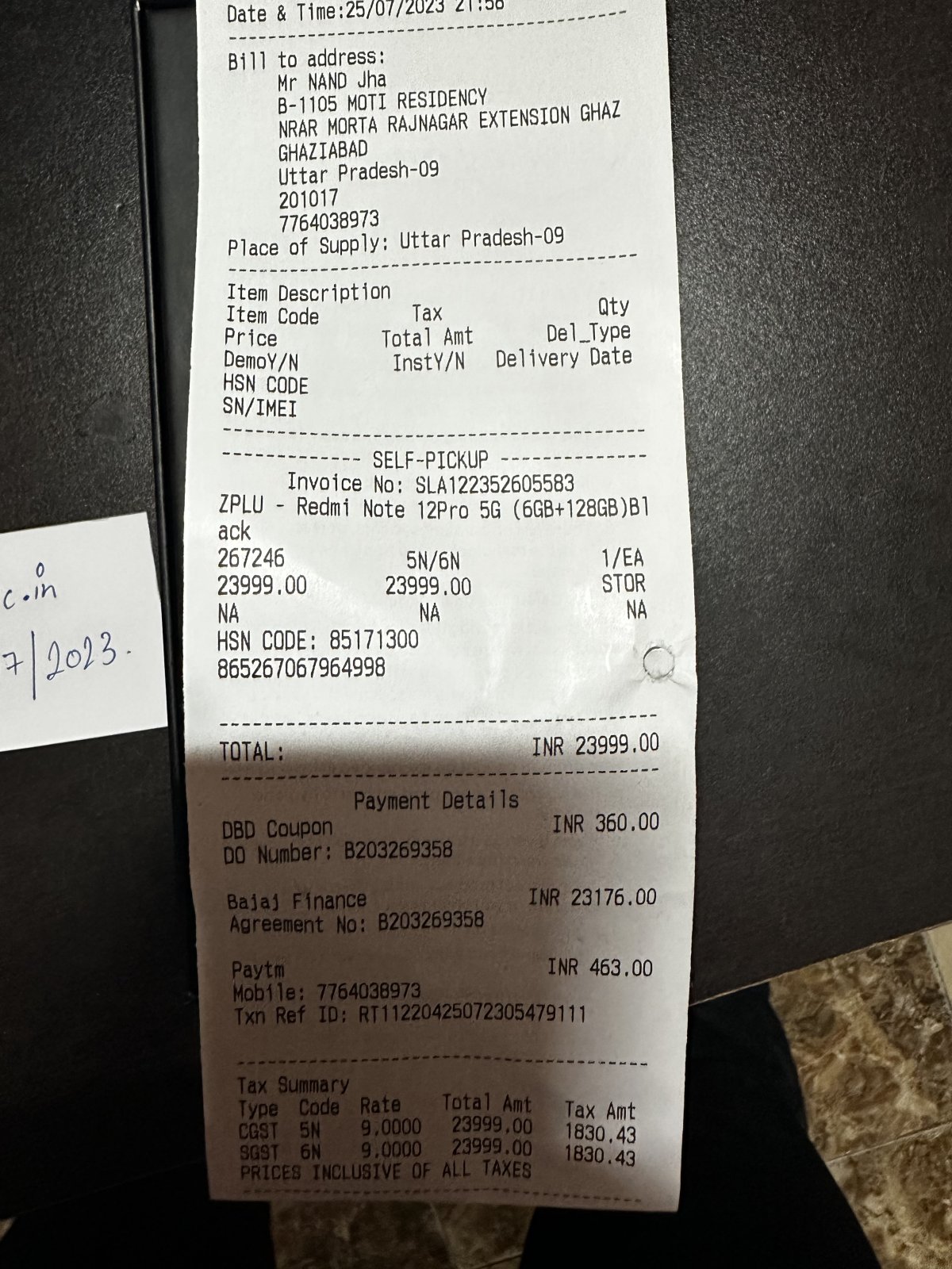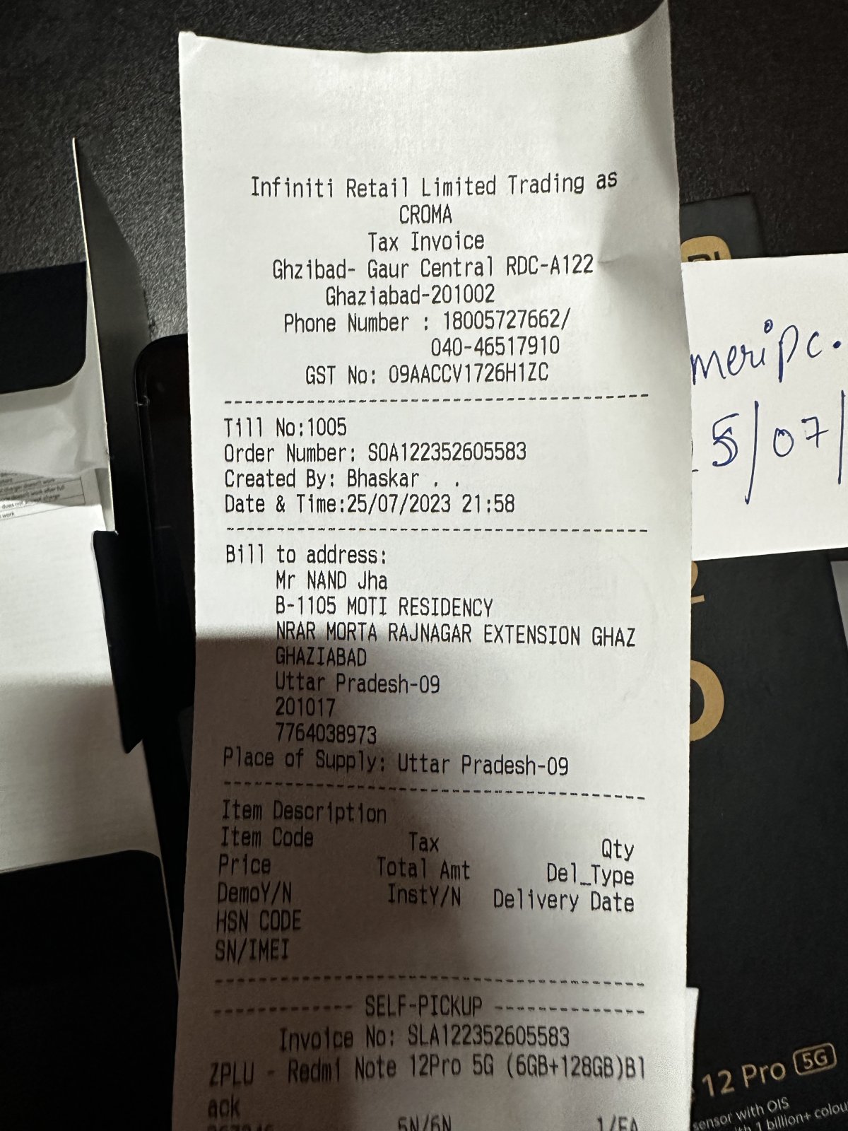 Purchased on 25/07/2023 from Croma RDC Ghaziabad