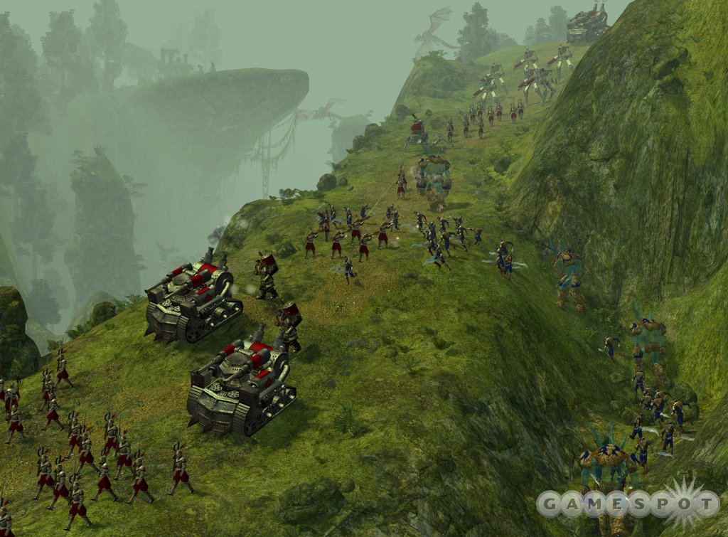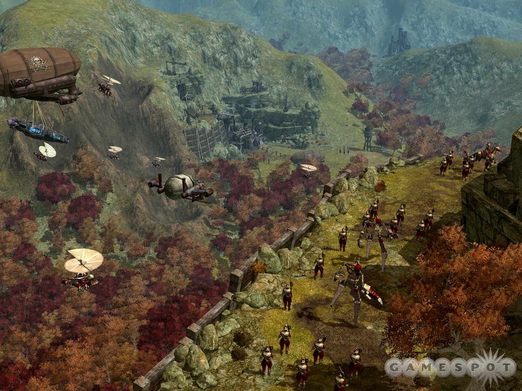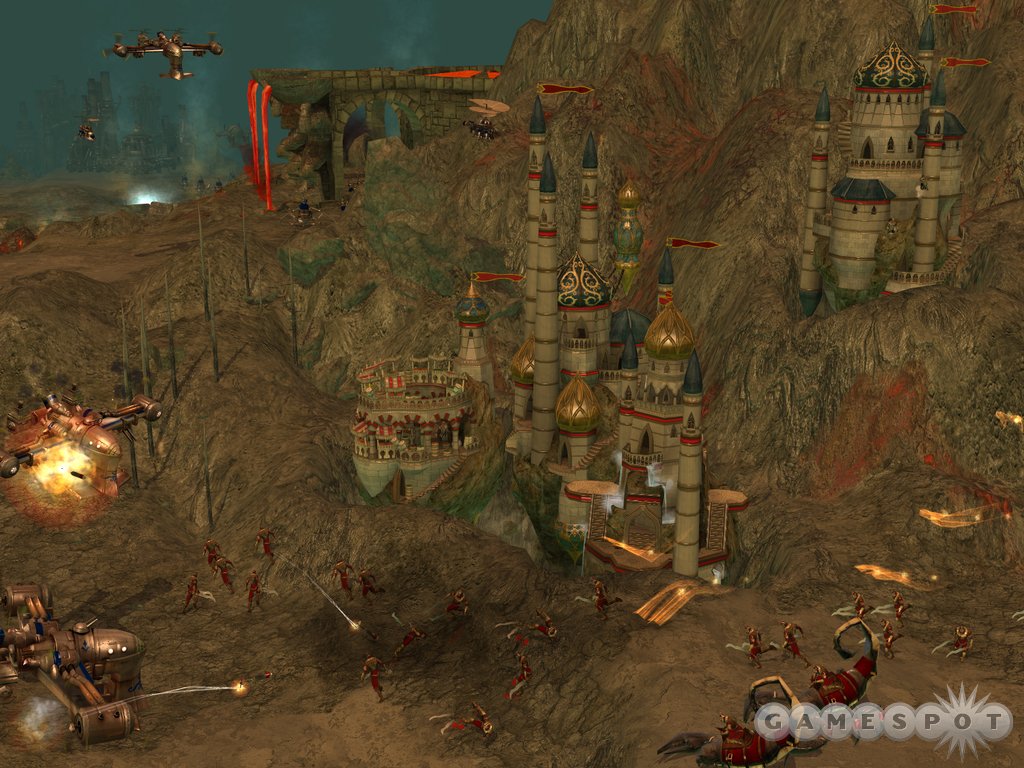 In addition to gorgeous graphics, Big Huge Games is licensing the Novadex physics engine. This will translate into realistic physics, of course, but to appreciate what this means to Rise of Legends, all you have to do is watch the chaos erupt when a towering city comes under siege. Towers collapse realistically, knocking down their neighbors, while huge pieces come crashing to Earth, smashing anything below. We even saw a humongous cannon get destroyed, and the heavy barrel fell and began rolling downhill, crushing everything in its path. It’ll also be possible to both destroy bridges and create choke points on the map.