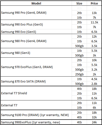 1tb - 970evoPlus G3, 980 G3, 980pro G4, 990pro G4, 990evoPlus G5