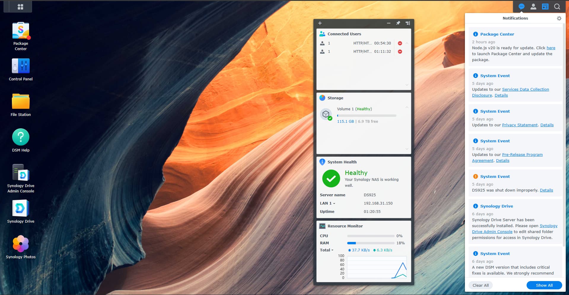 It looks and feels like a full-fledged desktop experience with Synology’s proprietary software. The home screen is beautiful, where you can add or remove performance statistics widgets. There is a notification panel also, which logs the important notifications like – If something needs and update or, the NAS has been shut down unexpectedly.