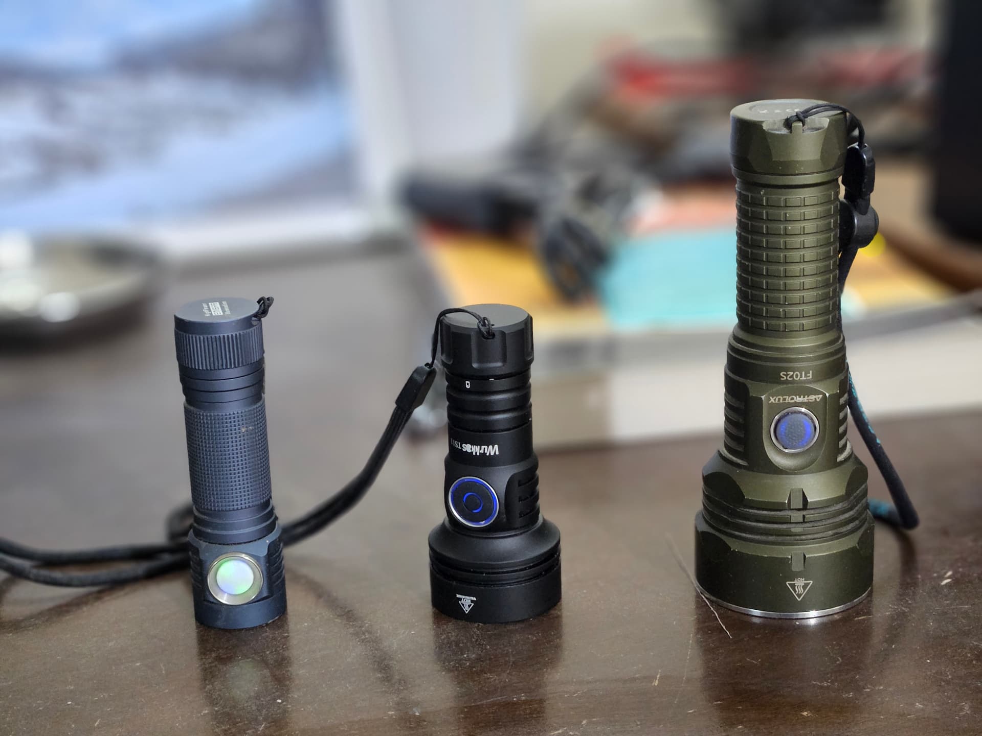 Missing from this shot, Wurkkos HD15R, White + Red emitters, headlamp that I use for astrophotography and random projects at home, and Wurkkos TS10, tiny 14500 (AA size) flashlight with LH351D emitters, quite literally a pocket rocket.