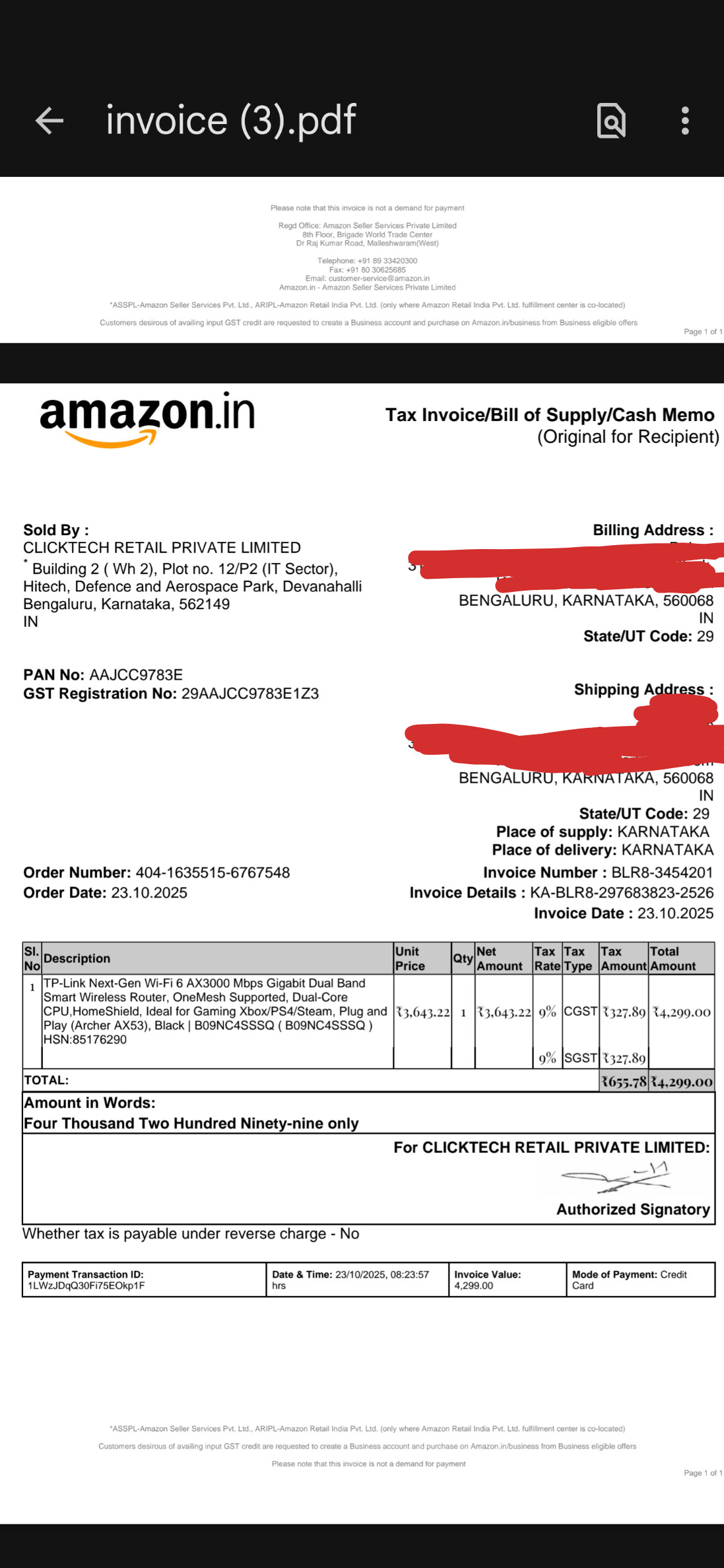 Bought for ₹4299 with original invoice attached