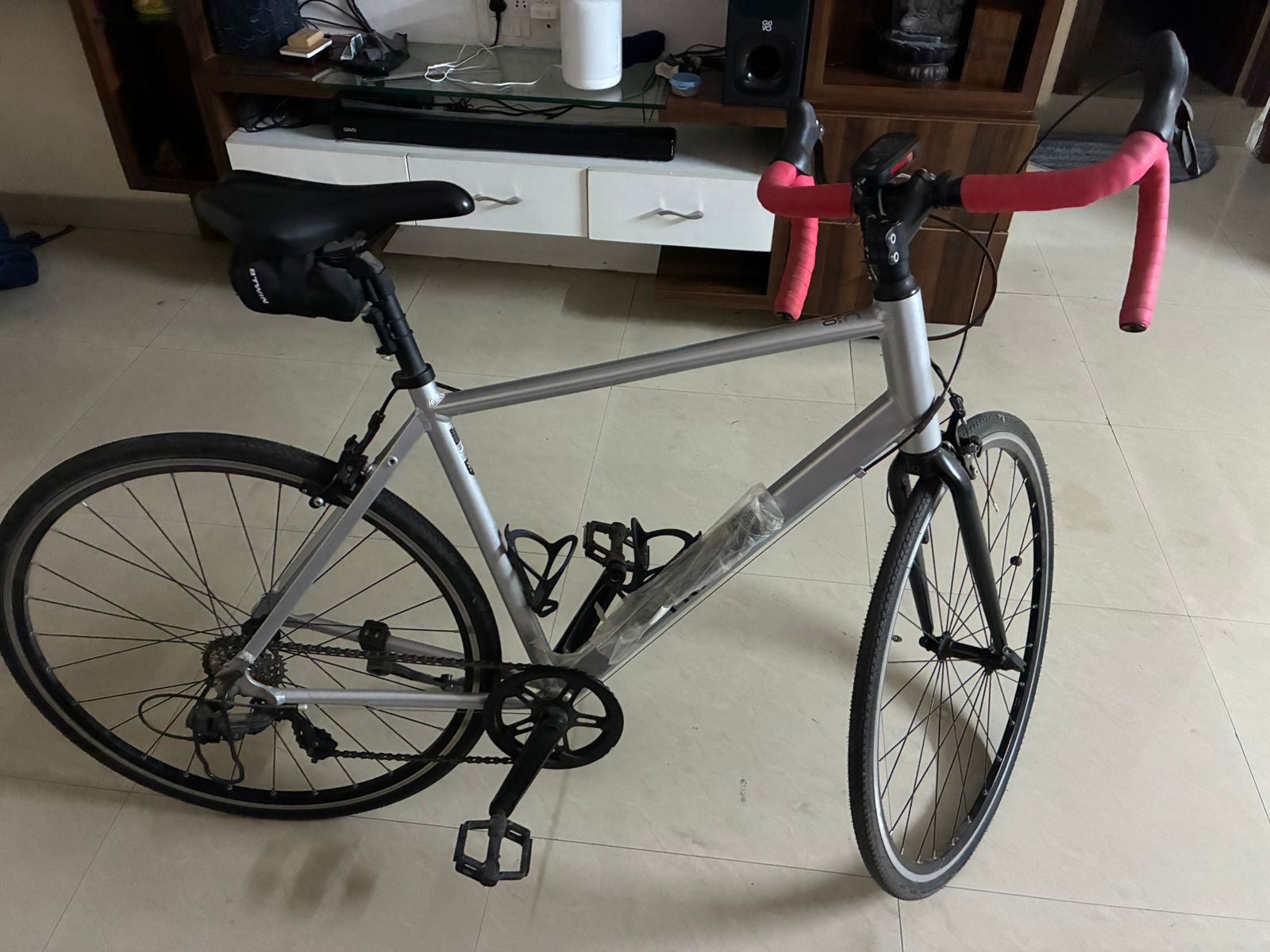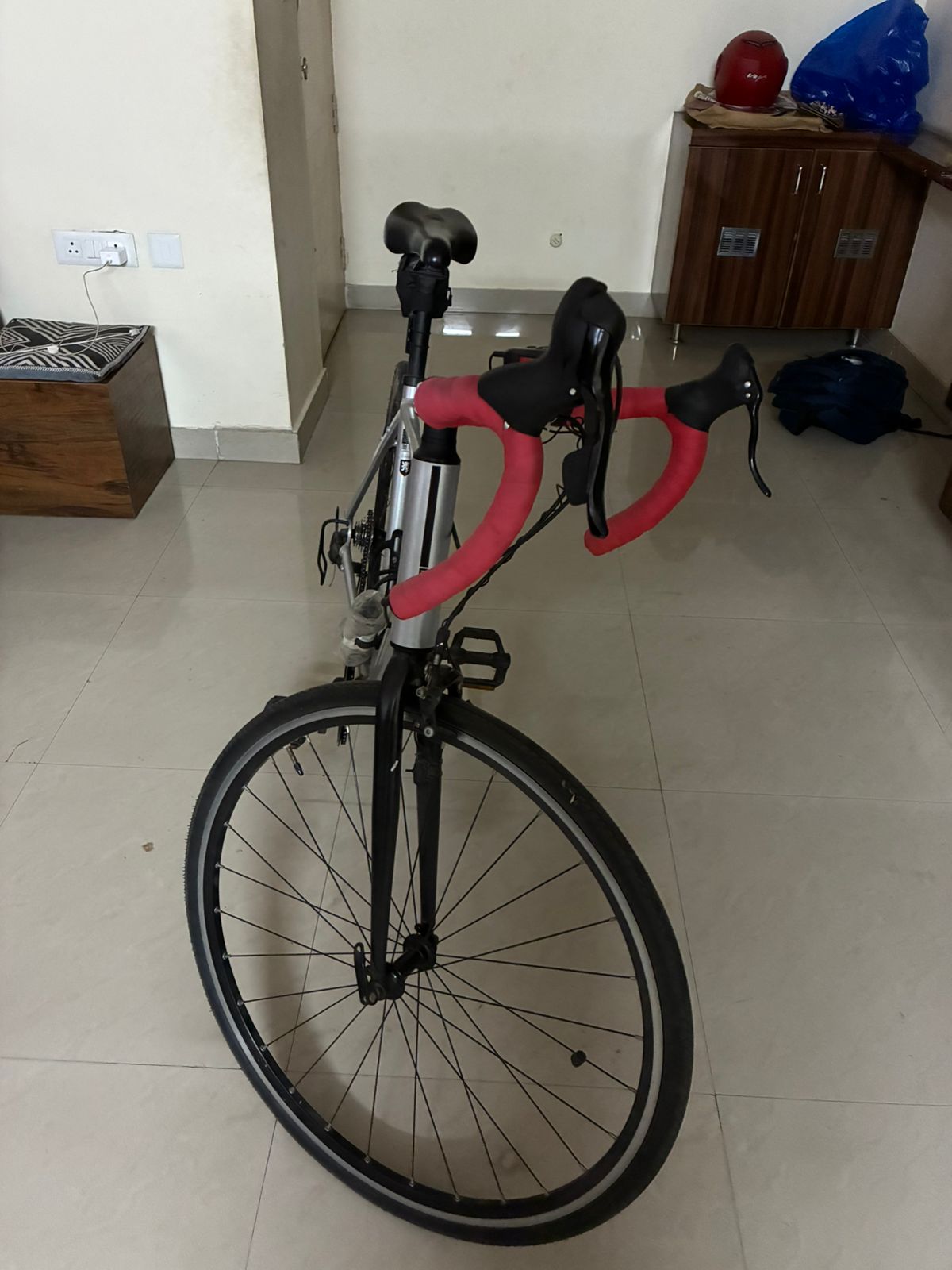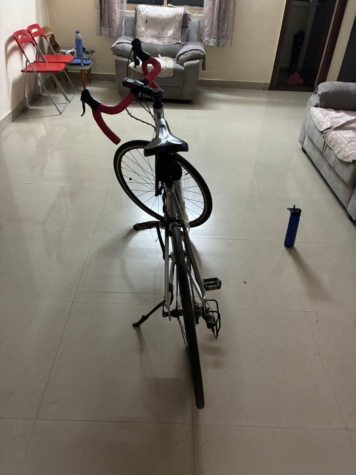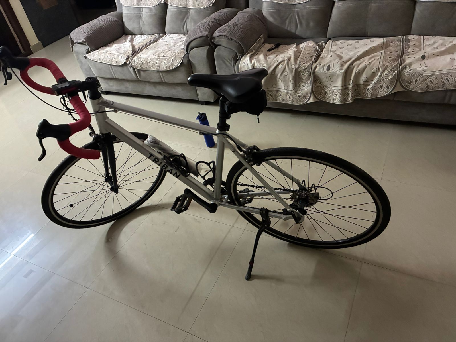 The white road bike from TRIBAN By Decathlon features a lightweight frame and aerodynamic design, offering speed and efficiency for long rides and competitive cycling. Equipped with smooth gears and reliable brakes, it provides a comfortable and responsive ride. Perfect for road cyclists, it delivers durability, speed and performance across various terrains.