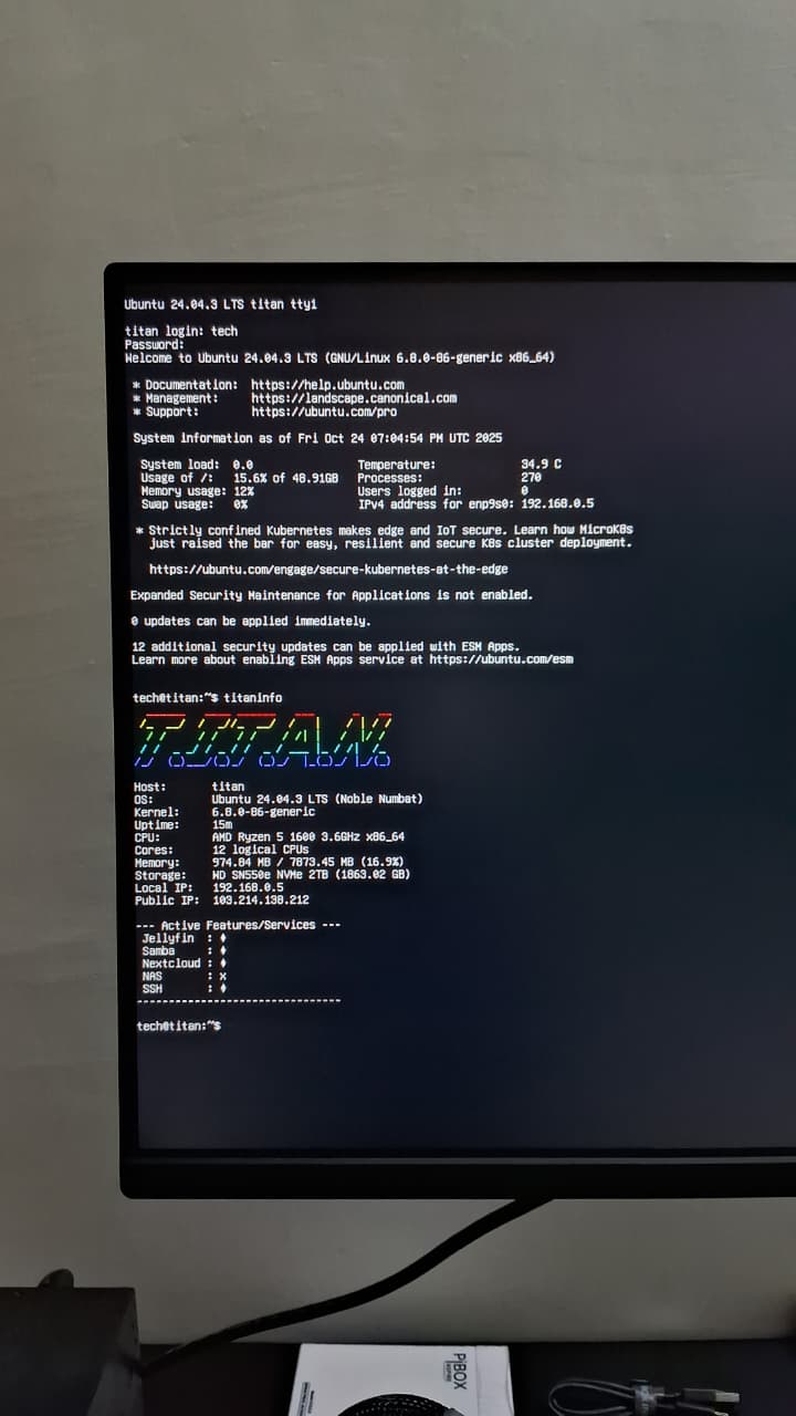 And day 1 requirements were Network Attached Storage, Media Server, Local network Workspace - which have been achieved via Samba, Jellyfin, and NextCloud.