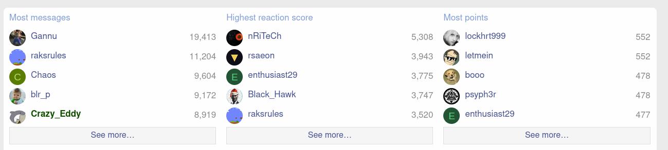 OT .There is a thread for credit /debit card help . Some way to give points or may be create a thread to acknowledge the help provide .Reward the user with some points should also be considered. regarding the ladder i would say display as stars .yellow stars for posts . Hearts for likes . Good trade repo with some other icon .You can choose the parameter/ milestones for level .Instead of skilled adept etc.