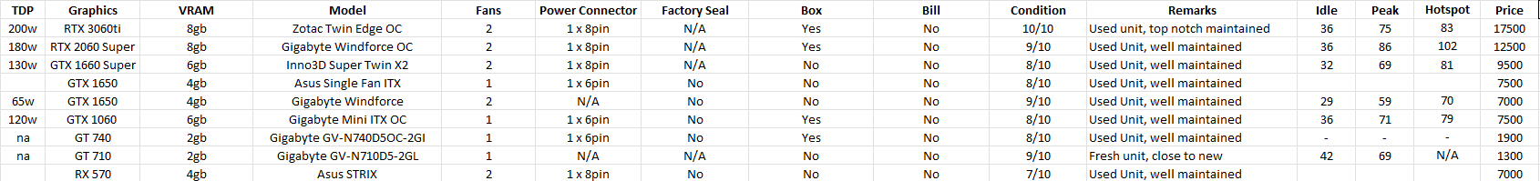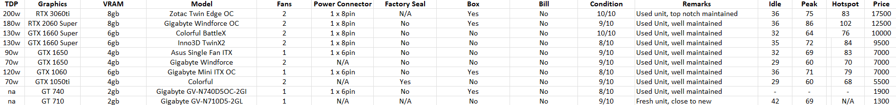 Each one has been opened, and fully serviced by me (clean, repaste) → After which the 3hr burn in test has been done, and resultant temps listed on the above table.