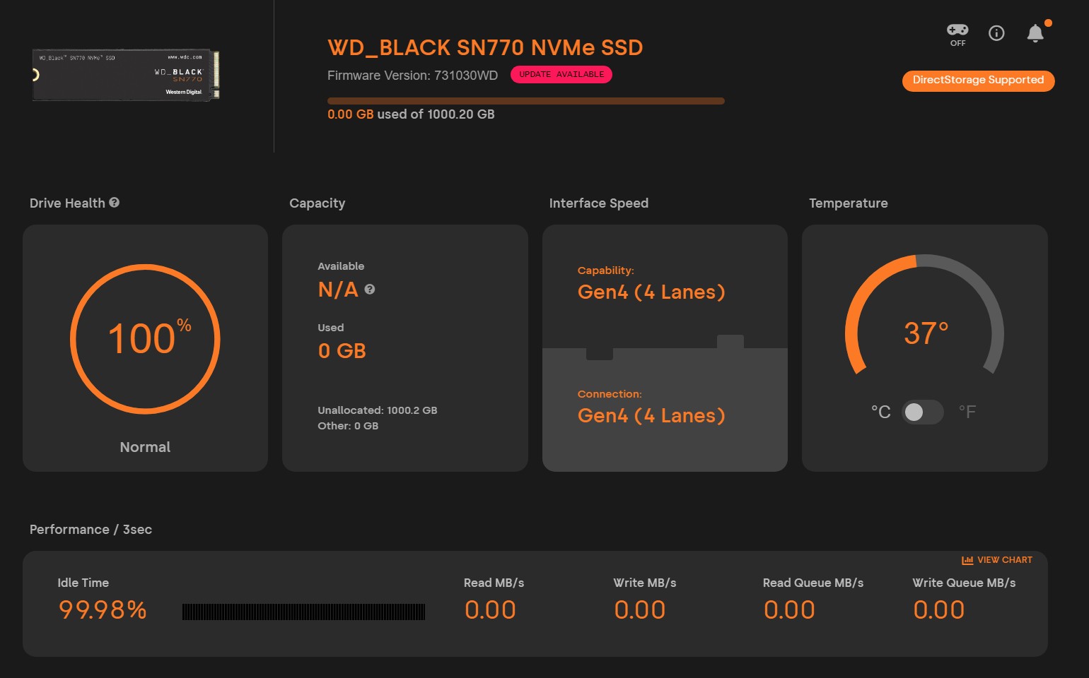 I had transferred about 400 GB from the 990 Pro to the SN770. It is close to 40 degrees when idle and 70 under load, which is okay considering both drives are in a laptop. I had also taken a screenshot of the write performance but deleted it unintentionally. It was about 2500 MBps peak and the cache seemed to give way at around 300 GB, after which the speed was around 410 MBps, which is as expected considering it uses high quality Kioxia BiCS NAND.