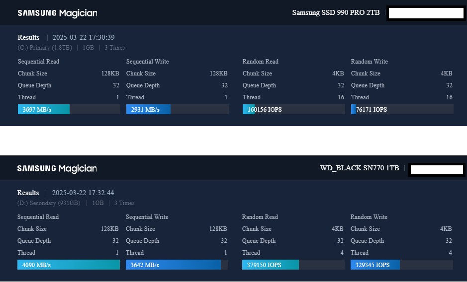 Edit: I had Bitlocker enabled by default on the 990 Pro which led to the lower benchmark for it compared to the 770. Updated the benchmark in the following post: