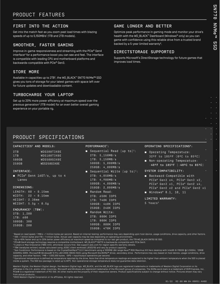 Product Name - Western Digital WD Black SN770 NVMe 1TB, Upto 5150MB/s, 5Y Warranty, PCIe Gen 4 NVMe M.2 (2280), Gaming Storage, Internal Solid State Drive (SSD) (WDS100T3X0E)