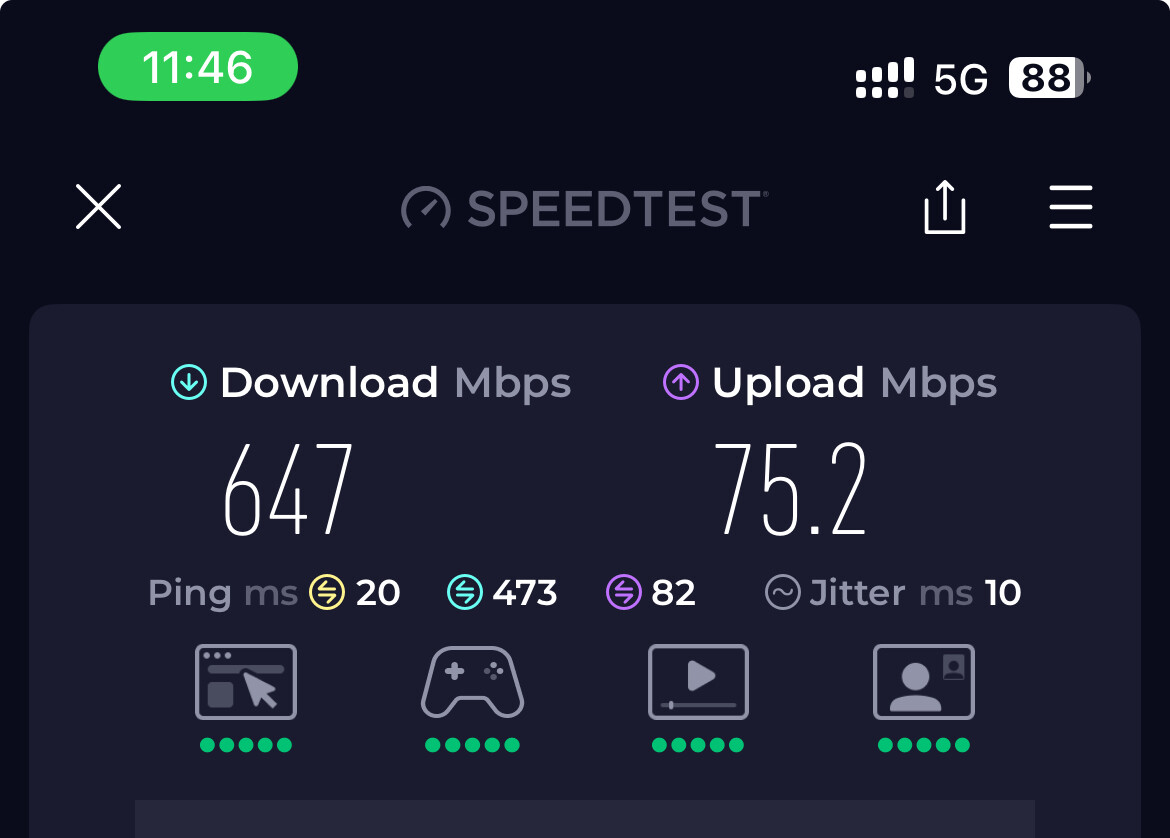 Speeds for me vary wildly on cellular (8-600mbps), depending on time of day. On both Jio,Airtel 5G.