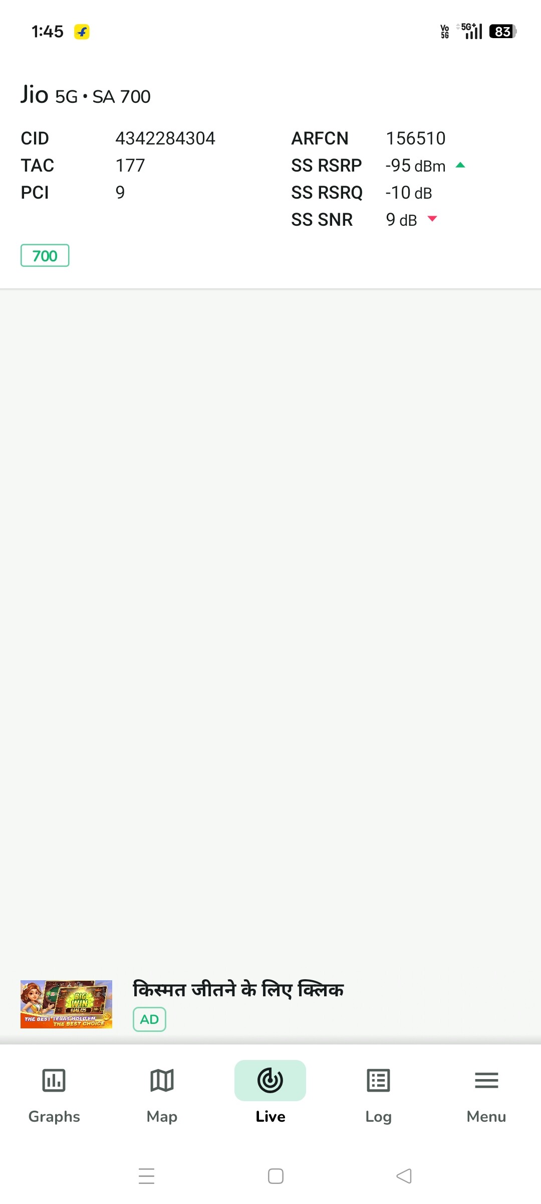 Explains why. Move around your place to find a 3700mhz / 3500mhz band. When you do, you can run a speedtest again and report back.