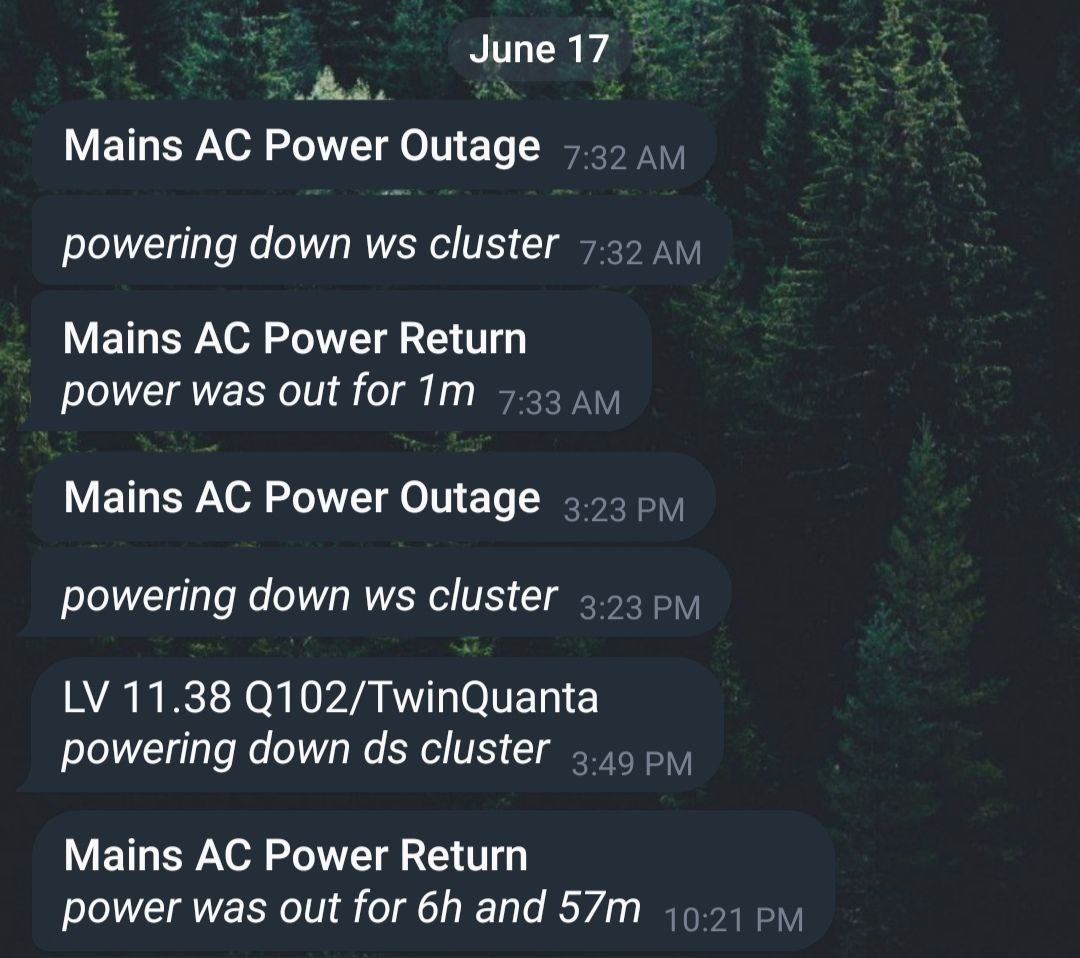 But there was enough power in all three battery banks (1x 100Ah, 2x 100Ah and 4x 26Ah) to run the essential cluster (home wifi, cameras and automation) along with fans and lights for another six and a half hours!